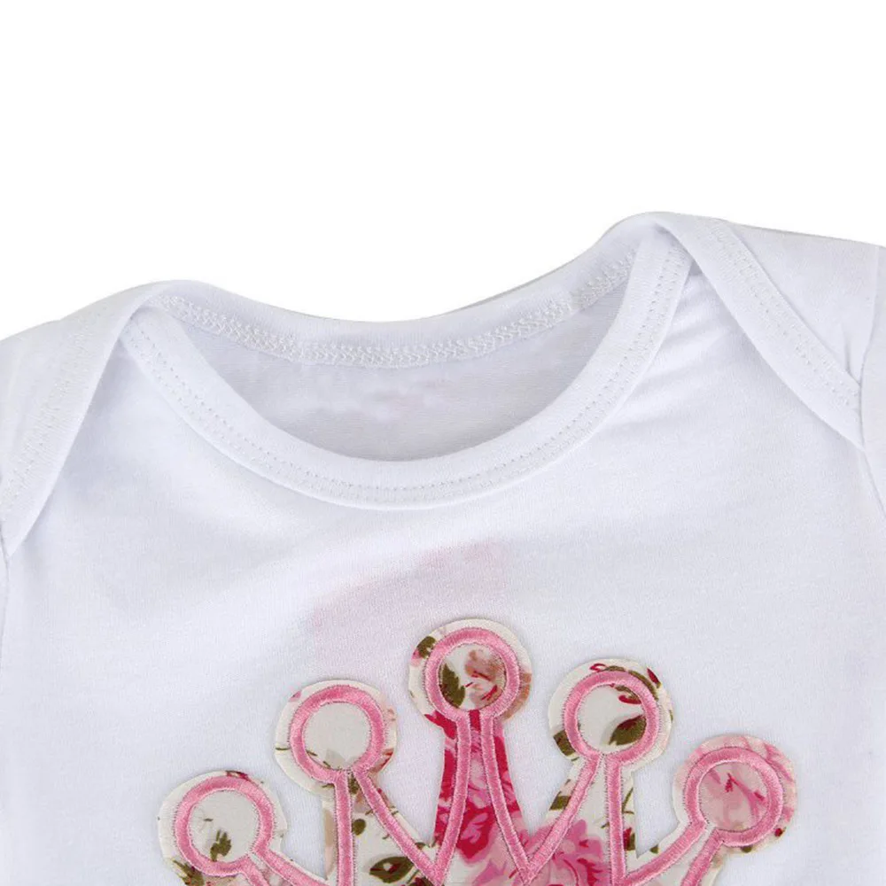 Короткие рукава, плечи с рюшами, спереди принт с блестящей короной, застежка на кнопках внизу для легкой смены подгузников