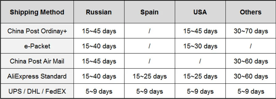 Авиапочта Китая: для Азии, Западной Европы, Северной Америки занимает 9-20 рабочих дней, для Южной Америки, Среднего Востока, Восточной Европы, Африки занимает около 15-30 рабочих дней.