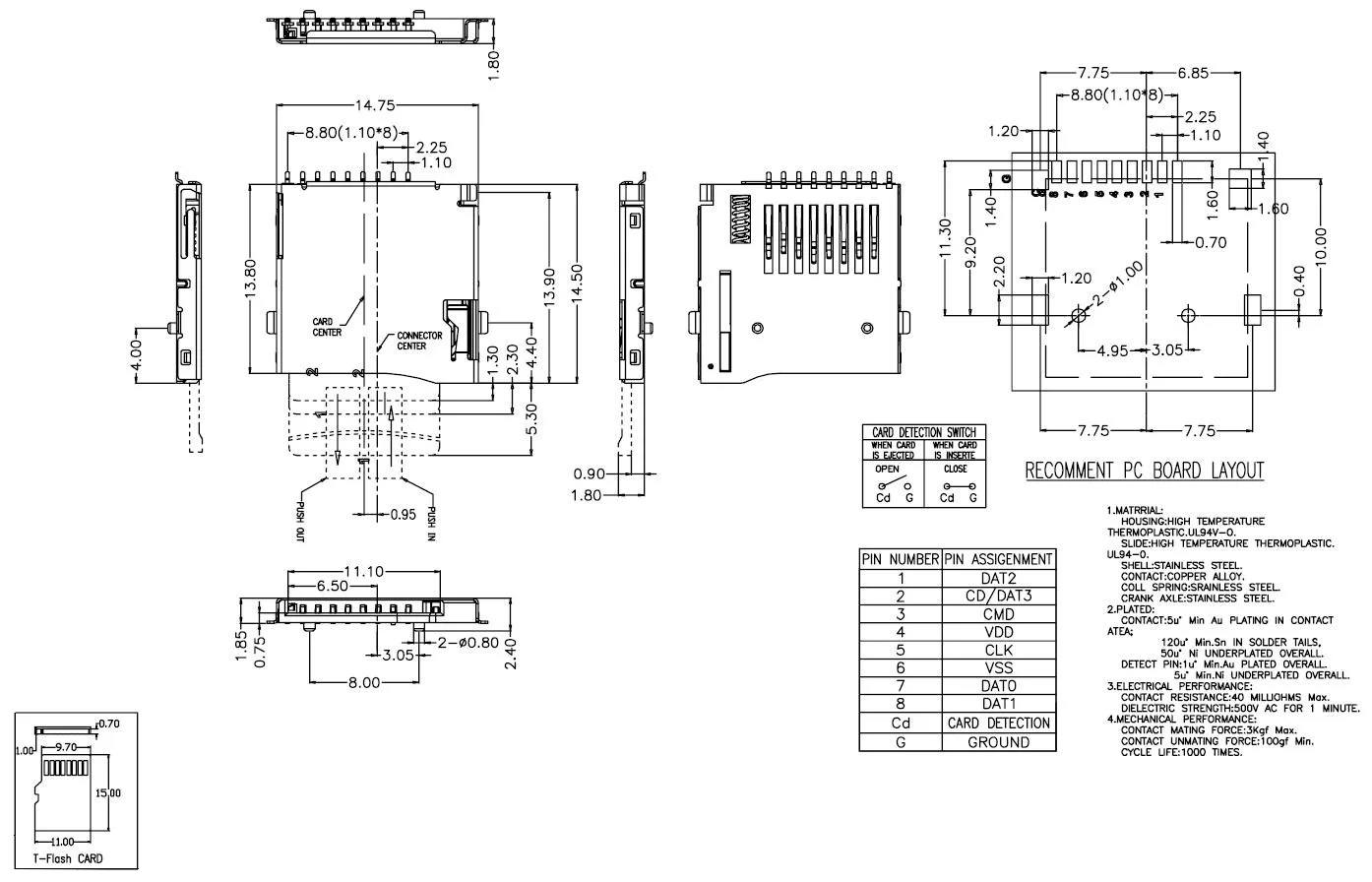 Тип: разъем TF карты PCB (нажимной тип без замка)