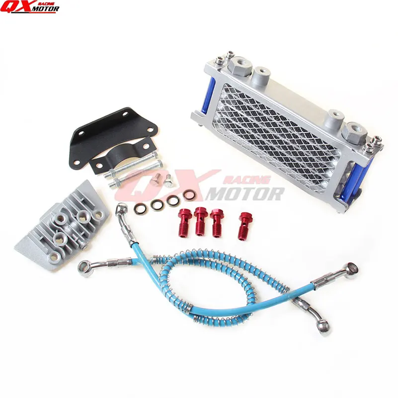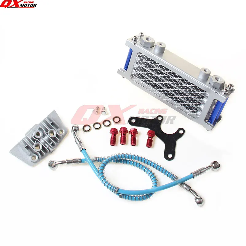 Высококачественный масляный радиатор для 50/70/90/110/125/140cc горизонтальный двигатель dirt bike/pit bike/money bike/ATV Quad Отправляется в seel Масляный радиатор + 4 шт. Алюминиевый сплав красный цвет винт + два типа Кронштейн соединителя масляного охладителя + Масляный охладитель цветной шланг на входе охлаждающие шланги линия труба + Масляный радиатор крышка цилиндра двигателя (Просим вас оставить нам сообщение для накидного типа)