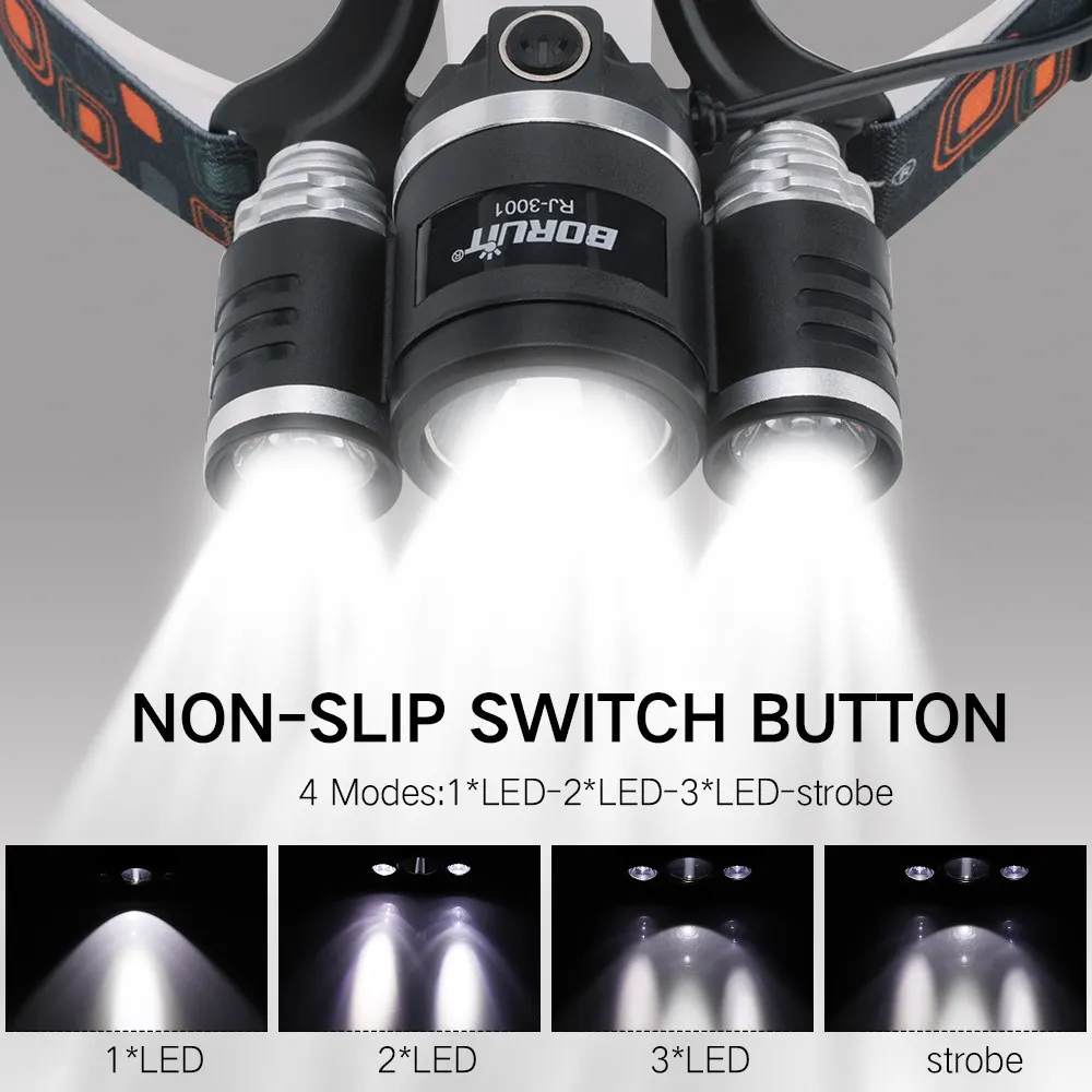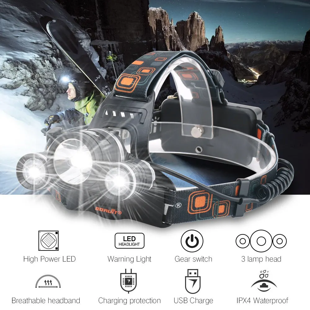 4 светодиода: яркий-средний свет-низкий свет-стробоскоп (белый свет) Светодиодные лампы: XML L2 + 2 * R5 Время зарядки: 7-8 ч Время работы: 4-6 часов Степень водонепроницаемости: IPX4, Ежедневный Водонепроницаемый, непромокаемый головной свет Источник питания: 2*18650 батареи Материал: головная лампа из алюминиевого сплава + Эластичная головная повязка