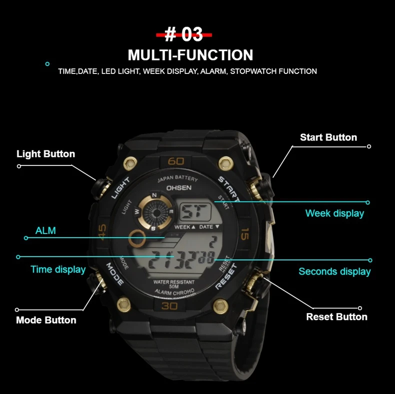 Цифровой: часы, минуты, секунды, вечера, месяц, дата, день Формат 12/24 часов Будильник и функция ежечасного звонка Специальная конструкция с хронограф (секундомер) при температуре не выше 0,01 второй шаг Водонепроницаемость до 30 м (не нажимайте кнопку в воде) Дополнительный ЖК-светильник для отображения времени в темноте Ударопрочность, подходит как для занятий спортом вне помещений, так и для занятий спортом внутри