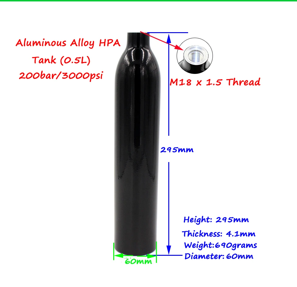 Описание Работает со сжатым воздухом Емкость 0,5л Рабочее давление 3000psi, испытательное давление 4500psi Толщина стенки 4,1 мм Вес нетто: 0.71kgs Высота бака: 295 мм Диаметр: 60 мм 20 лет жизни Сертификат TS; Сертификат производства TS 2210L81 GB11640 производственный стандарт Подходит для занятий страйкболом или пейнтболом Спецификация Диаметр изделия: 60 мм Высота бака: 295 мм Вес изделия: 690 г/861 г Цвет изделия: черный Материал корпуса: высококачественный алюминиевый сплав Посылка включает в себя: бак 0,5л * 1 (вариант 1) 0.5л бак с регулятором * 1 (вариант 2) Характеристика Гарантированное качество