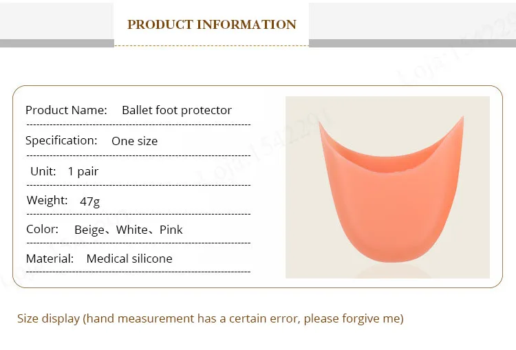 Информация о продукте 【Название продукта: 】 пуанты для ног 【Спецификация: 】 один размер 【Единица: 】 1 пара 【Материал: 】medical силикона 【Цвет: 】бежевый, белый, розовый 【Вес: 】 47 г 【Рекомендуемая толпа: 】 вальгусная деформация назад, трение боли, толпа на высоких каблуках, уход за передней частью, рекомендуется для любителей танцев Размер дисплея (Измерение вручную имеет определенную погрешность, пожалуйста, простите меня),