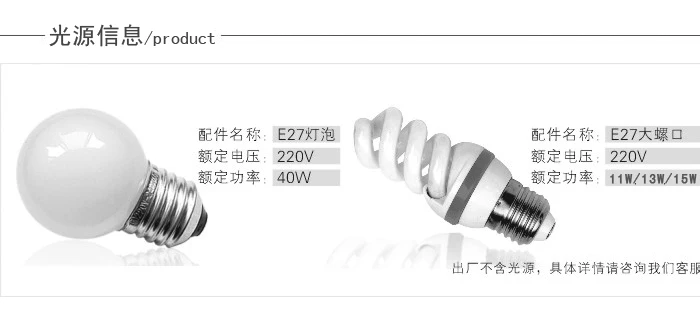 * Lightsource & bulbholder:E27 bulbholder, 3 лампочки/лампы, 3*5 Вт (светодиодный) или 7 Вт (Энергосберегающая лампа) или 25 Вт (можно использовать энергосберегающую лампу или светодиодный лампу), лампочкиНе входит в комплект
