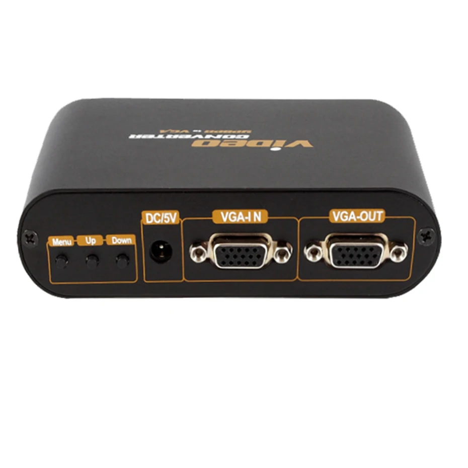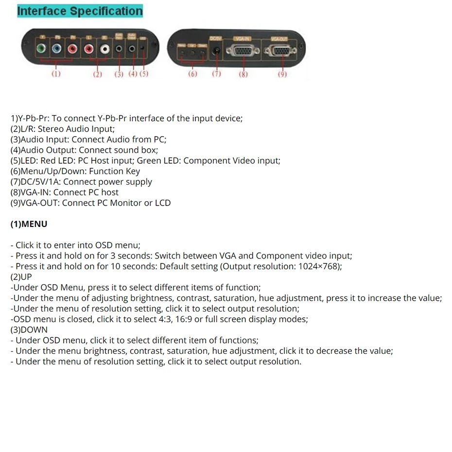 -Вход: 1 X VGA, 1 X компонентное видео (Y-Pb-Pr), 1 X стерео аудио; -Выход: 1 VGA, 1 аудио; -Выходное разрешение является необязательным. Выберите в меню OSD; -Разрешение VGA: 640X480; 800X600; 1024X768; 1440X900; 1400X1050, 1600X1200; 1680X1050; 1920X1200; 1280X768; -Поддерживаемое разрешение компонентного видео: 480i, 576i, 480p, 576p, 720p, 1080i, 1080p(50 Гц/60 Гц); -Яркость, контрастность, насыщенность, оттенок регулируются; -Поддержка ПК и компьютеров MAC; -Портативный Размеры: 12,8 × 9,4 см × 3,4 (Ш) см;