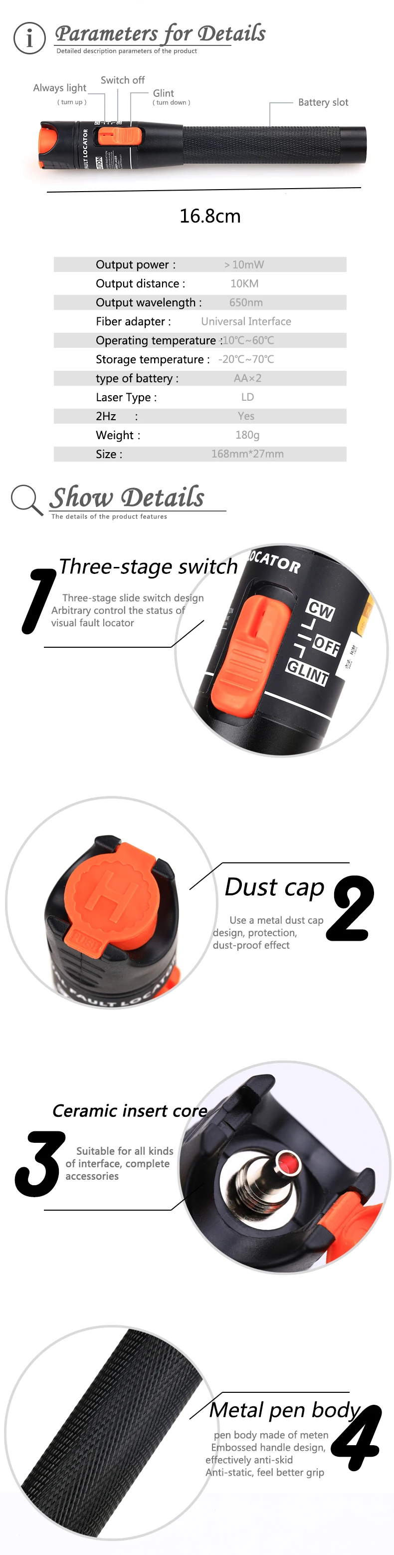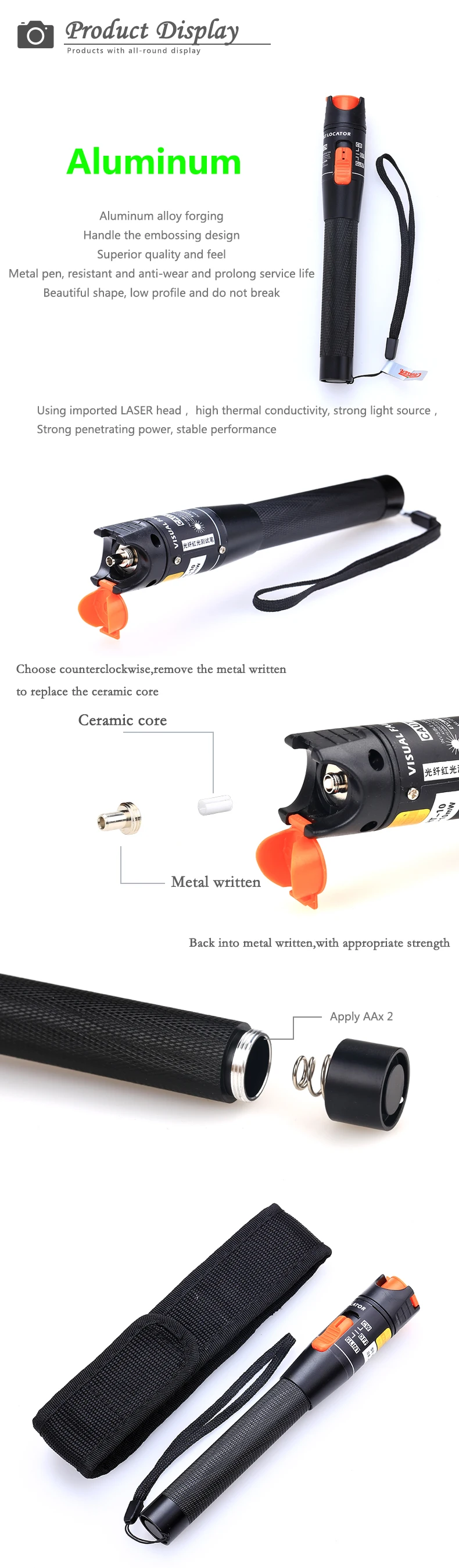 10 МВт Волоконно-оптический визуальный дефектоскоп 10 км Диапазон красный лазерный тестер, алюминиевая ручка, универсальный SC/ST/FC адаптер + 2 шт гильзы
