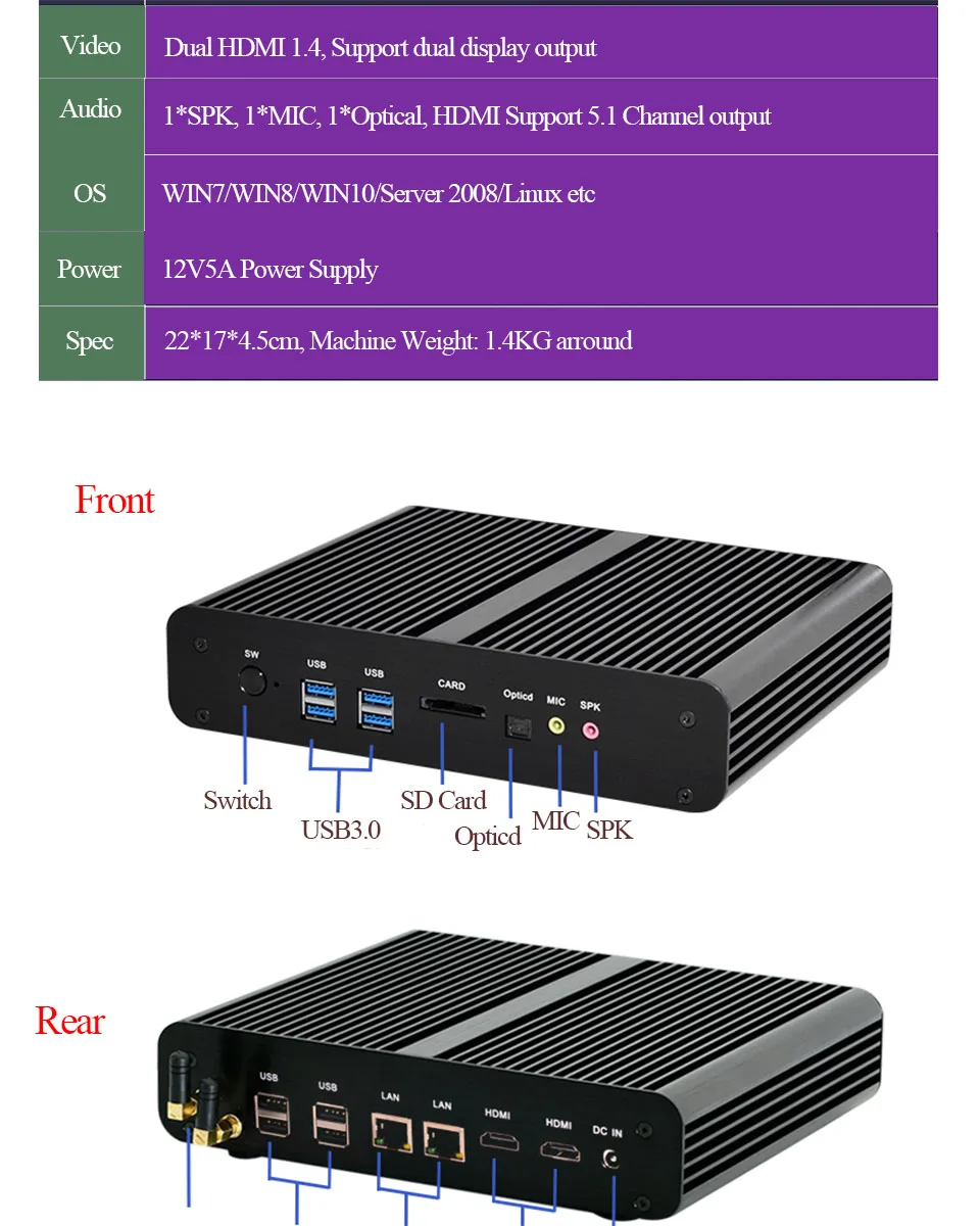 Задние порты | 1 * DC IN 1 * HDMI 1 * Порт DP 4 * USB 3.0 порт 1 * порт LAN (RJ45) 1 * микрофон 1 * SPK |