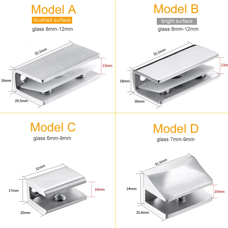 Название продукта: стеклянный зажимМатериал: нержавеющая сталь 304Модель A/B: для стекла толщиной 8-12 ммМодель C: для стекла толщиной 6-9 ммМодель D: для стекла толщиной 7-9 мм Упаковка: 2 шт./лот Дисплей---------------------Руководство для покупок