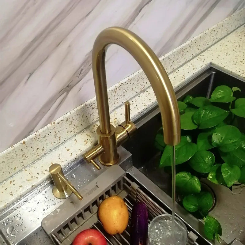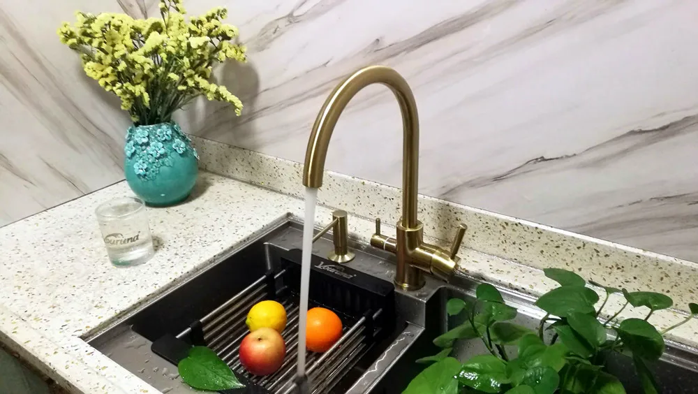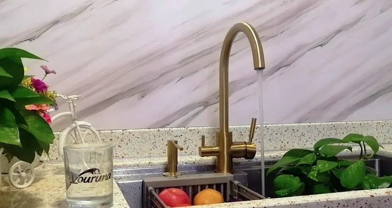 ♛Подача горячей и холодной воды рычагом смесителя на правой стороне ♛Распределяет фильтрованную воду с левой стороны рычага (при подключении к комплекту фильтров для воды можно также подключить к неразмягченной подаче воды)-см. Аксессуары для комплектов фильтров для воды. ♛Носик крана имеет отдельную внутреннюю трубку для фильтрованной воды, чтобы избежать смешивания с нефильтрованной ♛Стильный современный дизайн В Хромированном/матовом золотистом/черном покрытии Используются керамические клапаны, простота установки ♛Экономит место и беспорядок-нет необходимости в отдельном кране для питьевой воды или отверстиях в раковине, просто замените свой текущий кухонный кран этим 3-сторонним краном ♛Легко подключить и заменить существующий кран
