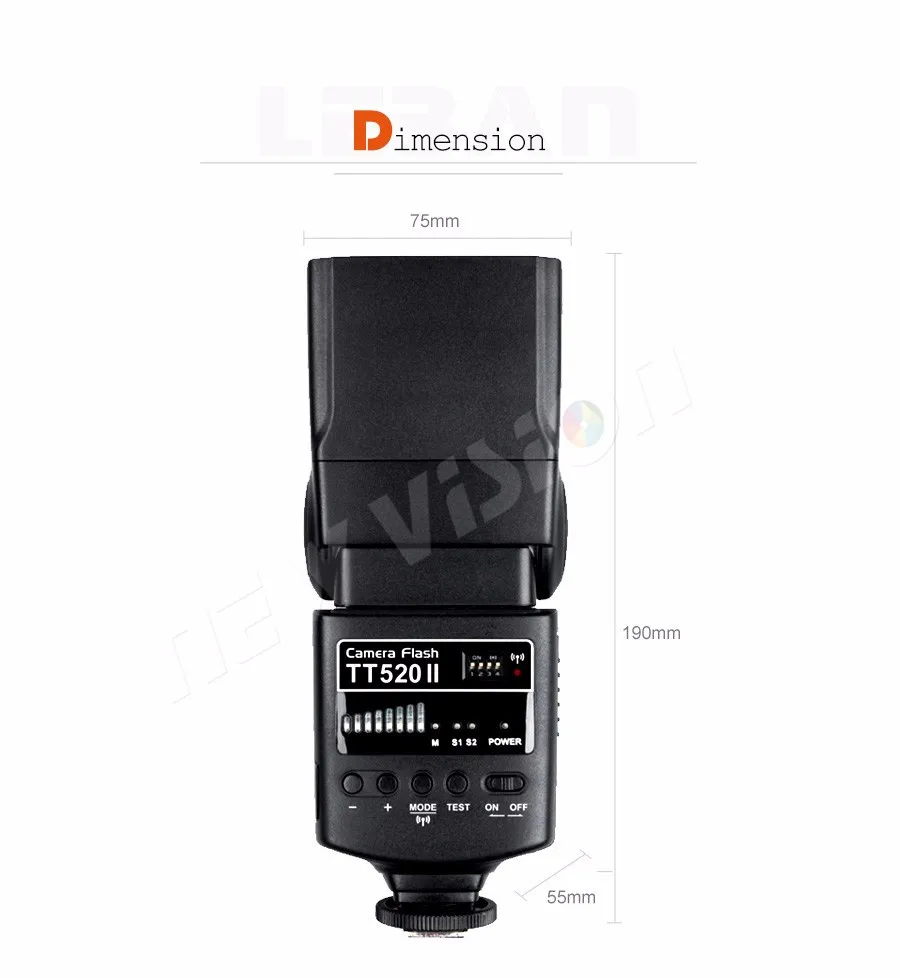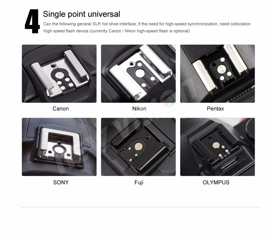 Совместимость с:Все DSLR камеры со стандартным горячим башмаком, такие как Nikon, Canon, Pentax, Olympus и т. д. Но кроме Sony и Minolta, потому что они используют различные горячий башмак.
