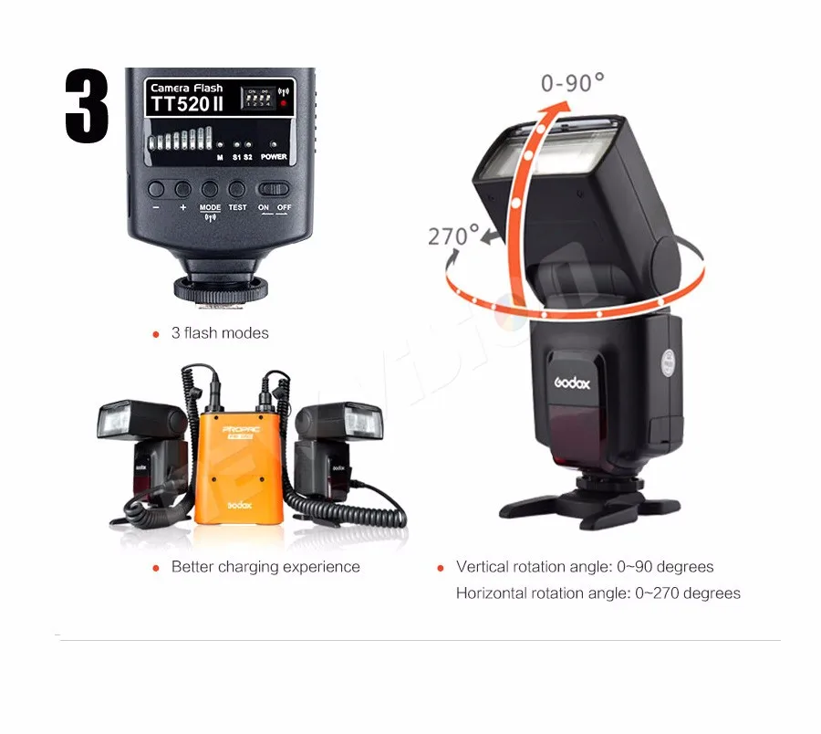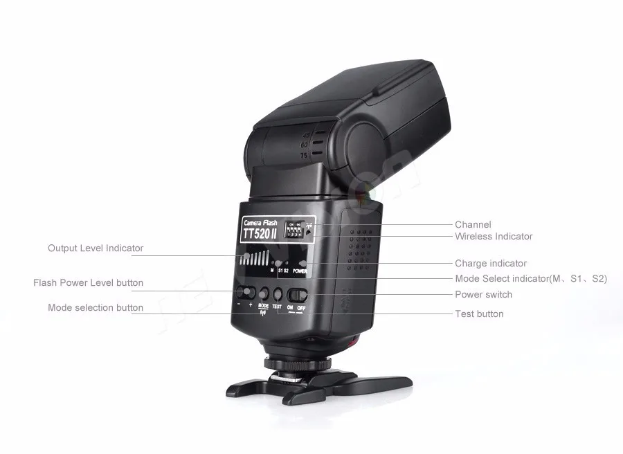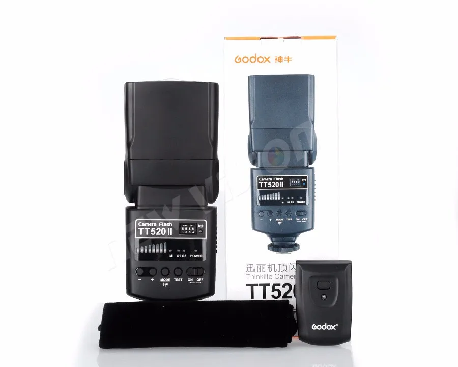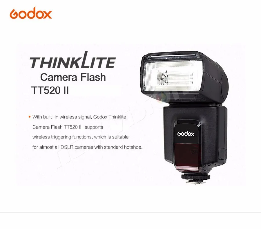 Godox Thinklite Камера Flash TT520II со встроенным 433 МГц беспроводным сигналом для Canon Nikon Pentax Olympus DSLR Camera sБлагодаря встроенному беспроводному сигналу эта вспышка Godox Thinklite TT520II поддерживает функции беспроводного запуска, которая подходит практически для всех DSLR камер со стандартным горячим башмаком.Основные характеристики:-С беспроводной передачей 433 МГц, передатчиком RT и 16 каналами для запуска-1/300s-1/2000s Продолжительность вспышки, четкие и яркие изображения-3 режима вспышки: M, S1 и S2 для повышения универсальности и удобства использования.-8 переменных выходов вспышки от 1/128 до полного, удовлетворяя ваши требования к фонарику.-Несколько авто-самозащиты для энергосбережения и от перегрева.-Добавлен с гнездом синхронизации и портом быстрой зарядки для внешнего блока питания.-Интегрированная отражающая панель, придающая особое значение глазам-Встроенный рассеиватель с широкой панелью, создающий мягкое и естественное освещение