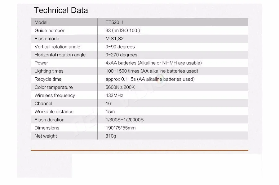 Техническая дата:Модель: TT520IIНомер руководства: 33(m ISO 100)Режим вспышки: M, S1, S2Вертикальный угол вращения: 0-90 градусовУгол горизонтального вращения: 0-270 градусовМощность: 4Xaa батареи (щелочные или Ni-MH могут использоваться)Время освещения: 100-150 раз (используются щелочные батареи AA)Время рециркуляции: прибл. 0,1-5s (используются щелочные батареи AA)Цветовая температура: 5600 ± 200KБеспроводная Частота: 433 МГцКанал: 16Рабочее расстояние: 15 мПродолжительность вспышки: 1/300s-1/20000sРазмеры: 190x75x55ммВес нетто: 310 г