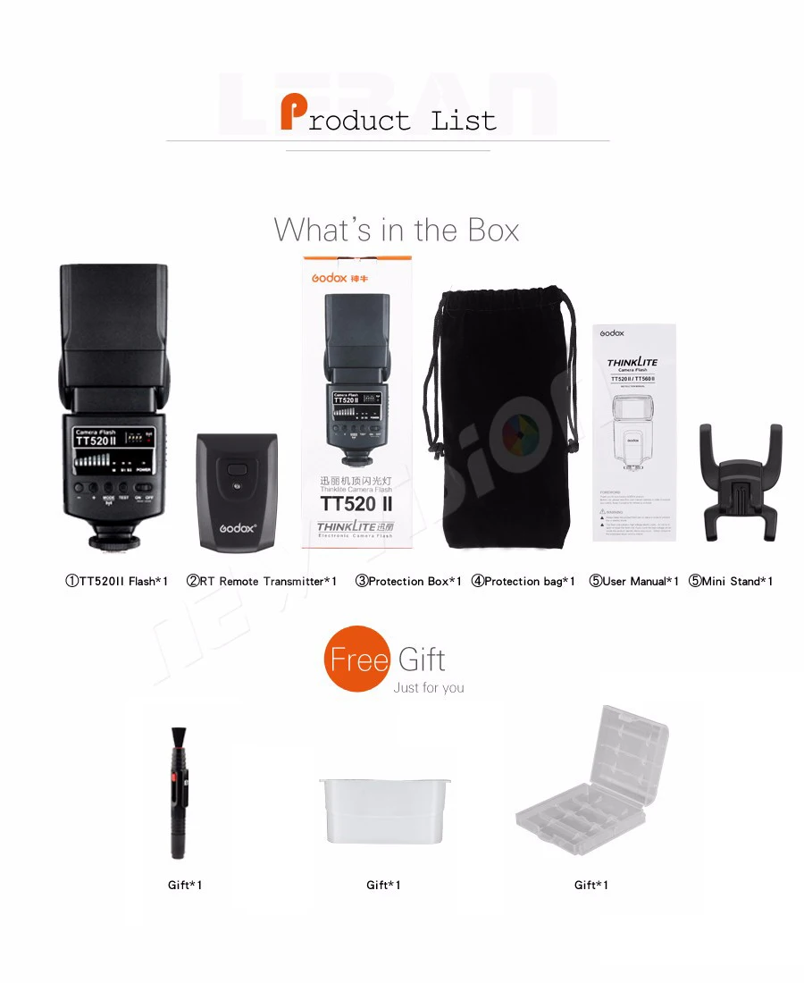 Посылка включает в себя:1 x вспышка Godox TT520II1 дистанционный передатчик RT1 мини-подставкаЗащитный чехол-1 шт.1 x Руководство пользователя