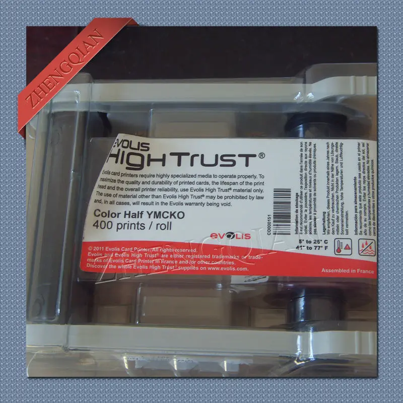 Ленты Evolis R5H004NAA с полупанелью включают в себя желтые (Y), пурпурные (M) и панели cyan (C) для печати полноцветных изображений. Полноразмерная черная полимерная панель (K) используется для печати текста и штрих-кодов, а панель наложения (O)-Тонкая Защитная панель, которая наносится на поверхность карты.
