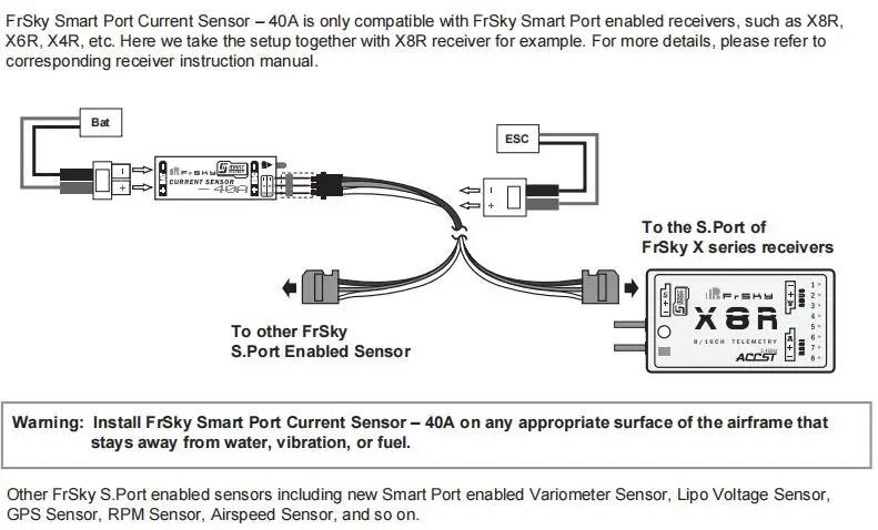 Датчик тока FrSky Smart Port был разработан для работы с системами интеллектуальных портов FrSky, он может измерять ток (A) и напряжение батареи (V) при подключении между батареей и ESC. Другие смарт-датчики с поддержкой порта FrSky, включая Вариометр, напряжение Lipo, GPS, RPM и датчики скорости полета, могут использоваться одновременно. Датчик оснащен разъемами XT60 male и female, а также поставляется свинец типа male-male JR.