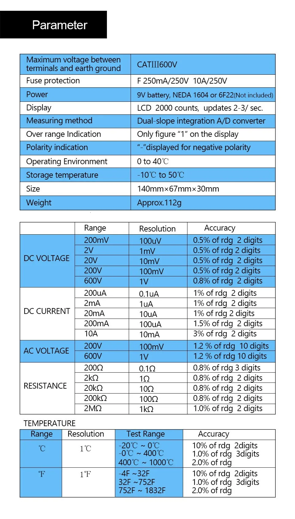 Напряжение постоянного тока: 200 мВ/2 в/20 в/200 В ± 0.5%, 600 В ± 0.8%