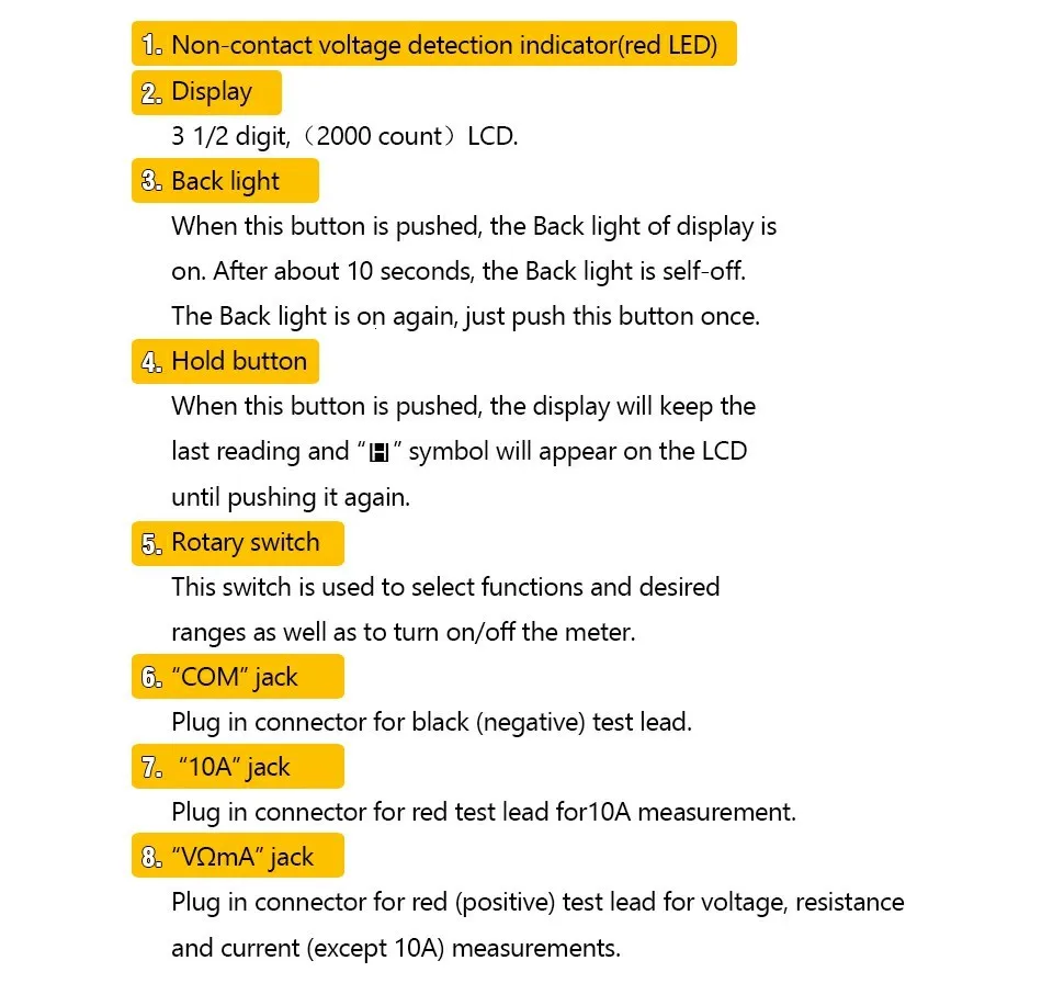 Функции, включая напряжение переменного/постоянного тока и постоянный ток, сопротивление, проверку диодов, испытание на непрерывность и температуру.