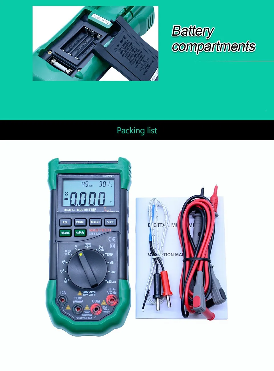 Этот измеритель представляет собой портативный профессиональный измерительный прибор с большим ЖК-дисплеем, чтобы показать три линии показаний, а также задний светильник для легкого чтения. Конструкция «одной руки» для переключателя диапазона делает измерение простым и легким. Защита от перегрузки и Низкая индикация батареи. Это идеальный многофункциональный инструмент с множеством практичных приложений для профессионального, мастерского, школьного, хобби и домашнего использования. -Измерительный прибор оснащен светильник и звуковым сигналом для предотвращения неправильного подключения тестовых проводов и обеспечения дополнительной защиты от повреждений, вызванных неправильной работой. -5 в 1 цифровой мульти-тестер был разработан, чтобы объединить функции уровня звука, яркости, влажности и температуры, а также Цифровой мультиметр. -Функция звукового уровня применима для измерения уровня шума на заводах, школах, офисах, аэропортах и дома, а также для проверки акустики студий, аудиторий и Hi-Fi установок. -Функция Яркости применима к измерению яркости поля с полной коррекцией косина для углового падения светильник. -Функции влажности и температуры подходят для измерения влажности и температуры окружающей среды, а также температуры объектов. -Цифровой мультиметр может выполнять измерения напряжения и тока переменного/постоянного тока, сопротивления, частоты, мощности, емкости, а также непрерывности и диодного теста. -На ЖК-дисплее отображаются показания и единицы измерения. -Доступны как Автоматический диапазон, так и ручной диапазон -Этот счетчик оснащен функцией автоматического отключения питания. -Этот счетчик оснащен функцией удержания чтения. -Этот счетчик оснащен функцией относительного измерения. Особенности: 1. Измерительный прибор оснащен светильник и звуковым сигналом для предотвращения пропуска тестовых проводов. 2. Доступны Автоматический диапазон и варианты ручного диапазона. 3. Защита от перенапряжения предоставляется для всех диапазонов. 4. Максимальное напряжение между клеммами и заземлением: 1000 В постоянного тока или rms переменного тока 5. Рабочая высота: макс. 2000 метров (7000 футов) 6. Дисплей: ЖК-дисплей, 3 показания одновременно 7. Максимальное значение дисплея: 3999 цифр 8. Полярность: Автоматическая; '-' для отрицательной полярности. 9. Индикация дальности: '0L' или '-0L' 10. Время выборки: прибл. 0,4 секунды на образец 11. Индикация единицы измерения: функция и единица измерения. 12. Автоматическое выключение: 30 мин. 13. Спецификация восстановленного предохранителя: F1 500мА/250В 14. Защита предохранителя: F2 10А/250В (быстрое действие). 15. Рабочая мощность: 1,5 В × 3 AAA батареи 16. Индикация низкого заряда батареи: ''на ЖК-дисплее 17. Температурный фактор: <0,1 × точность/° 18. Рабочая температура: от 0 до 40 ° (от 32F до 104F) 19. Температура хранения: от-10 до 50 ° (от 10F до 122F) 20. Размер: 195 × 92 × 55 мм 21 вес: Приблизительная 400 г (включая батареи) Характеристики: DCV: 400m/4/40/400/1000V ± 0.7% + 2 Переменный ток: 400 м/4/40/400 В ± 0.8% + 3; 750 В ± 1% + 3 DCA: 400μ/4000u/40m/400m ± 1.2% + 3 4/10A ± 2.0% + 10 ACA: 400μ/4000u/40m/400m ± 1,5% + 5 4/10A ± 3.0% + 10 Сопротивление: 400/4K/40K/400K/4M ohm ± 1.2% + 5 ; 40M ohm ± 2% + 5 Емкость: 40n/400n/4u/40u/100uf ± 3.0% + 3 Частота: 10/100/1K/10K/100KHz ± 2.0% + 5 Температура: -20 ~ 1000 градусов ± 2.0% ; -4 Фаренгейта ~ 1832 Фаренгейта ± 2.0% RH: от 20 до 95% ± 5.0%, Люкс: 4000/40000 люкс ± 5.0% Sount дБ: 40 ~ 100 дБ ± 3.5% Диодный тест, тестер непрерывности: зуммер, есл