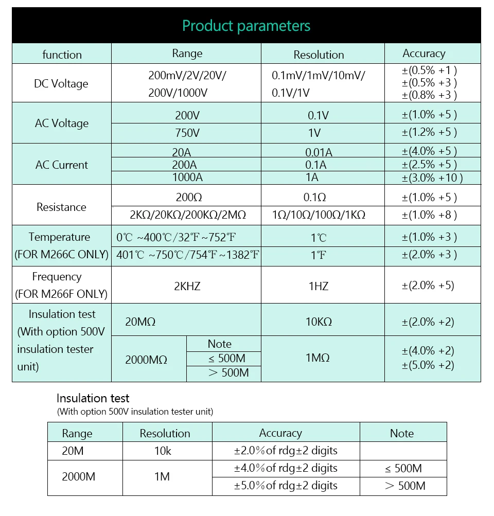 Изоляция (с опцией 500 в блок тестера изоляции): 20MΩ ±(2.0% + 2) 2000MΩ ±(4.0% + 2)