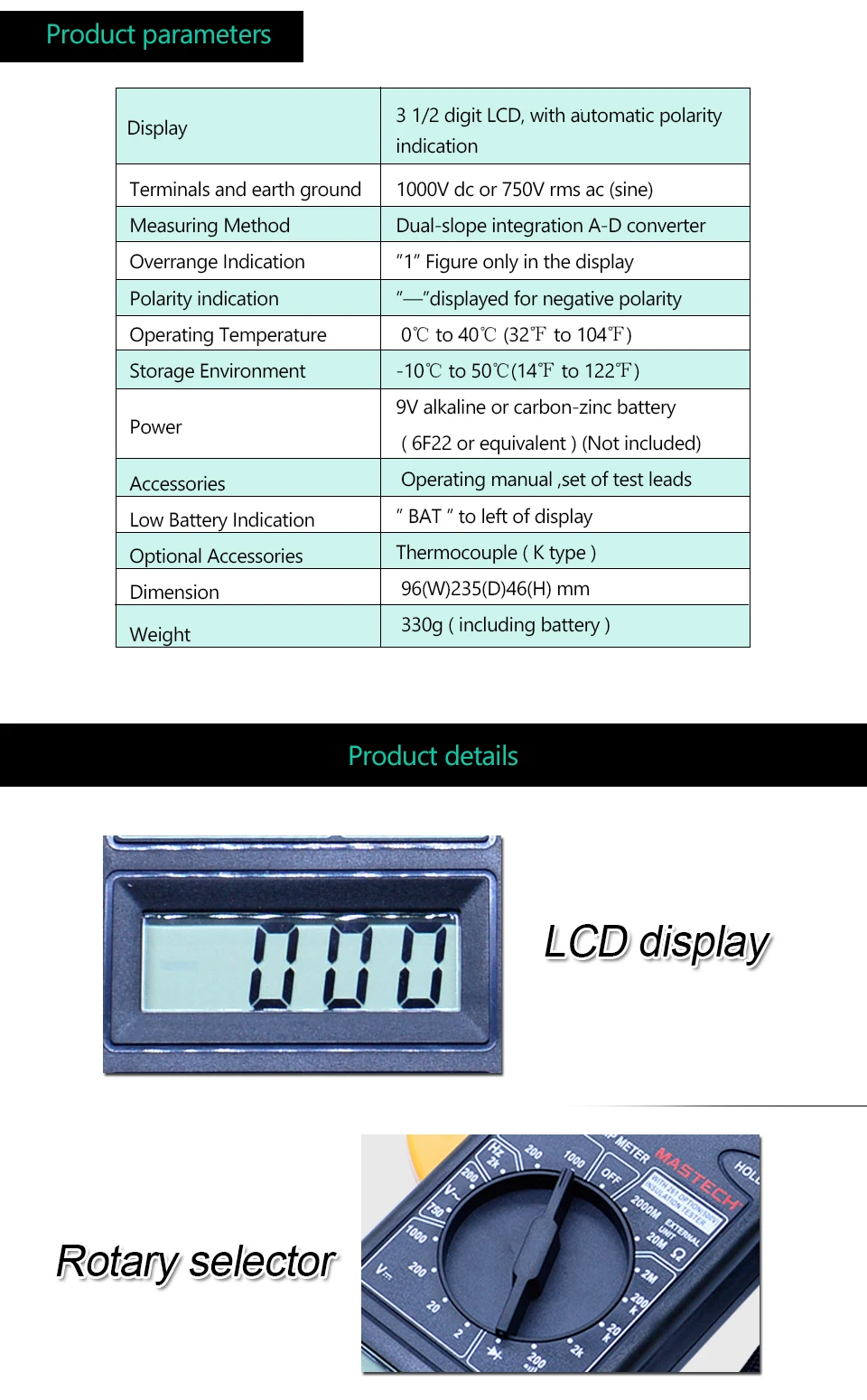 Напряжение постоянного тока: 2/20/200 ±(0.5% + 3); 1000 В ±(0.8% + 3)