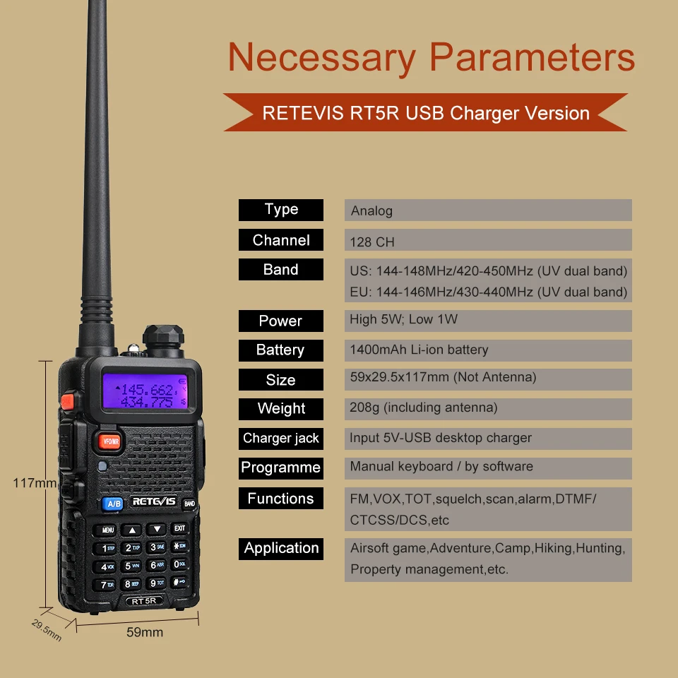 Retevis RT5R walkie talkie очень подходит для бизнеса, например, строительной площадки, церкви, ресторана, команды безопасности, а также хорошо работает в походах на открытом воздухе,Катание на лыжах, Круизный корабль, путешествия на автомобиле, охота и другие семейные мероприятия.