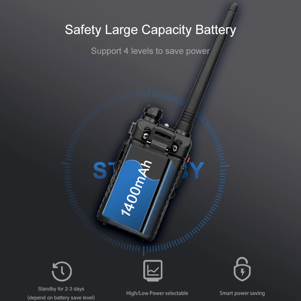 Не только аккумулятор RT5R емкостью достигает 1400 мАч, но RT5R имеет 4 уровня, чтобы сохранить батарею, нажмите меню и кнопку 3, чтобы выбрать Уровень экономии батареи.