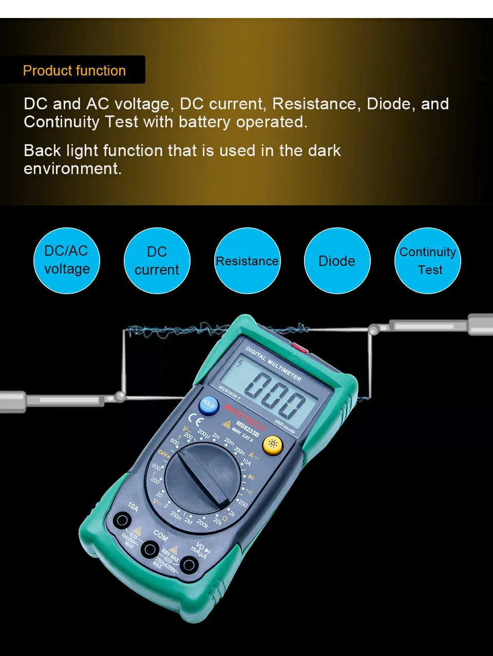 Напряжение постоянного тока: 200 мВ/2 в/20 в/200V ± 0.5% 600V ± 0.8%