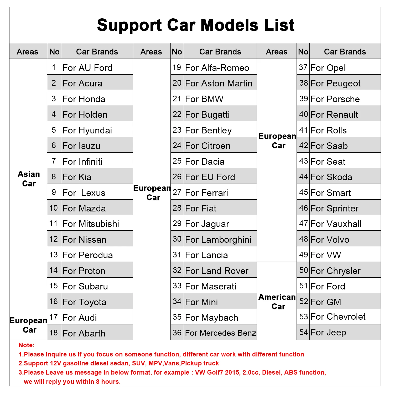 Азиатский автомобиль (модель с 1992 по 2017) Европейский автомобиль (Модель 1992-2017) Американский автомобиль (Модель 1992-2017) Примечание: 1. Поддержка 12В бензина, дизеля, седана, внедорожника, MPV, фургонов, пикапа. 2. Пожалуйста, свяжитесь с нами, если вы не уверены, что наше устройство совместимо с вашим автомобилем, например: VW Golf 7 2015,2.0cc,Diesel,ABS Функция. Спасибо! 3. Пожалуйста, свяжитесь с нами, если вы сосредоточены на ком-то функции, различные машины работают с различными функциями