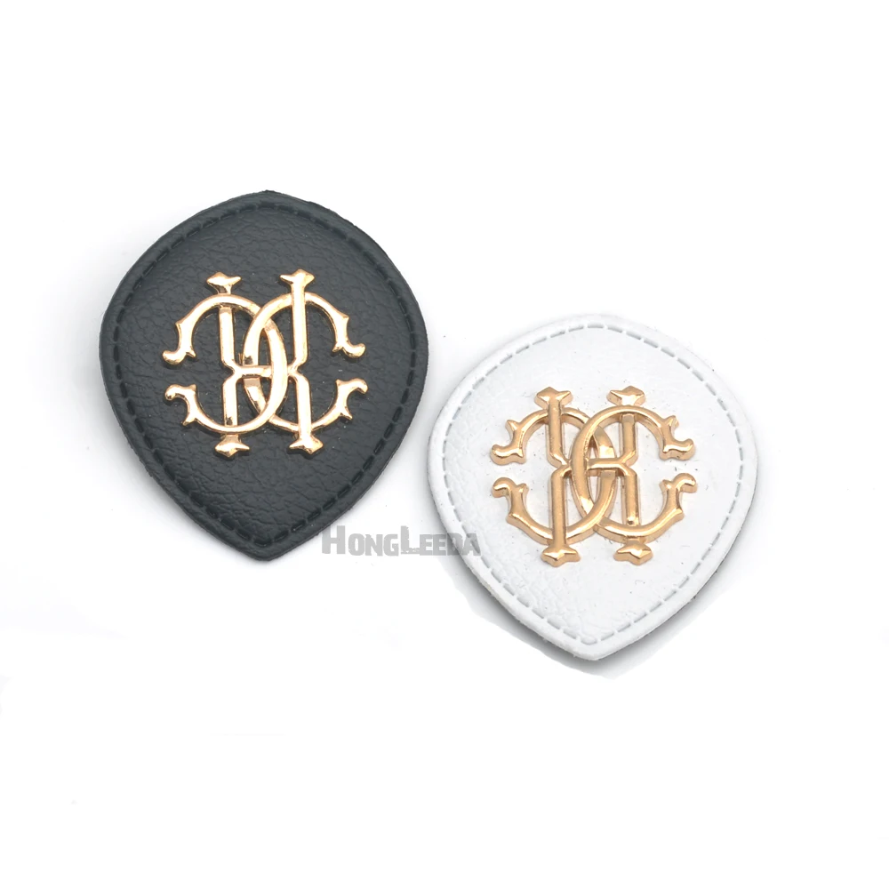 20 шт./лот черный/белый искусственная кожа пришить на значки модные этикетки с металлическим логотипом Одежда Этикетка для джинсов/куртка PLB-001 Цвет: черный из искусственной кожи + светло-золотой металлический логотип. Белый из искусственной кожи + светло-золотой металлический логотип. Размер: 4*4,7 см