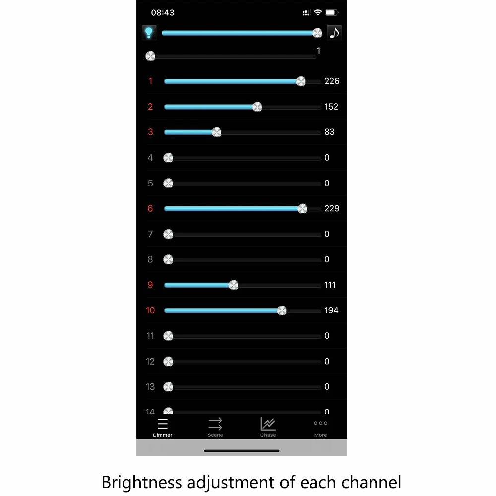 APP software "DMX512"-это приложение управления, используемое контроллером. Приложение может редактировать 512 каналов сигналов DMX. Пользователь может редактировать и звонить 8 статических сцен и 6 динамических сцен. Для получения подробных инструкций по эксплуатации обратитесь к руководству приложения.
