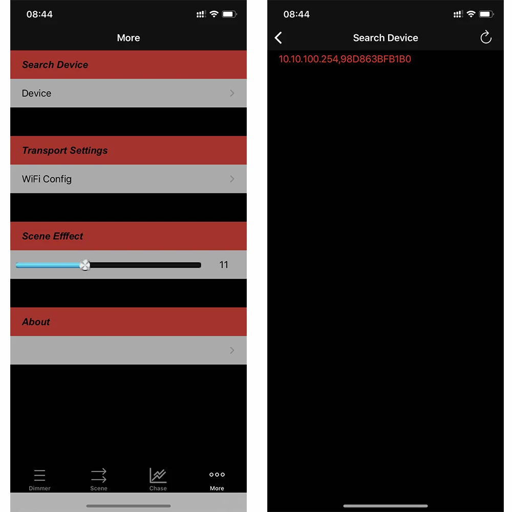 Во-первых, подключите независимый WiFi контроллера, с SSID WF310-xxxx. Затем откройте приложение для поиска устройства, и после поиска нажмите, чтобы выбрать устройство, которое будет контролироваться (красный означает выбрано) для запуска управления (устройства Android могут осуществлять поиск устройства и управлять им без выбора).