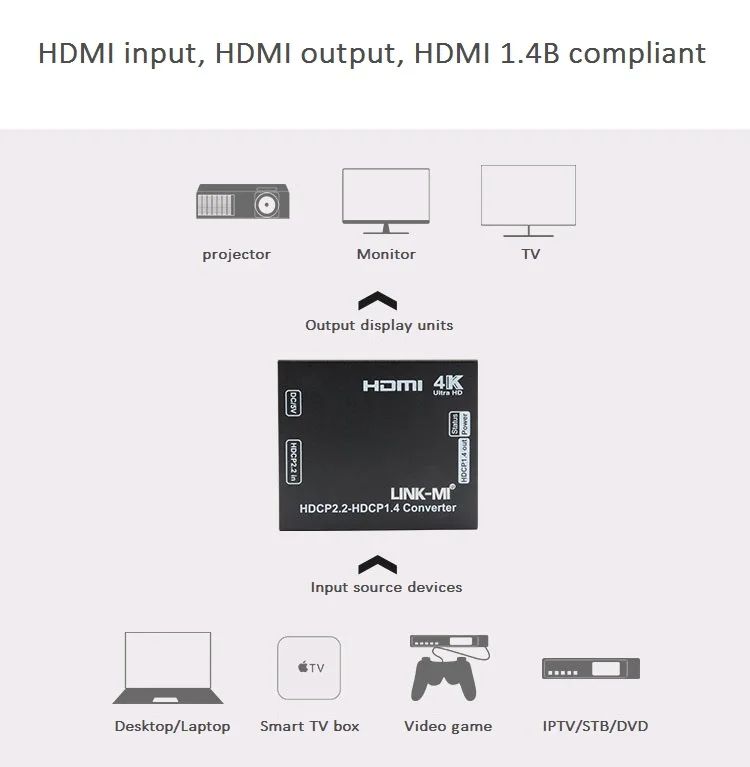LINK-MI LM-HDCP01 является новейшимКонвертер HDCP 2,2 в HDCP 1,4. Это окончательное решение для воспроизведения нового 4K HDCP 2,2 кодированного содержимого на 4K дисплеях со старым стандартом HDCP 1,4. Пользователь может подключить конвертер с устройствами HDCP 1,4 кУбедитесь, что источник HDCP2.2 может отображаться на дисплеях HDCP 1,4. Это поможет вам обойти/устранить/разблокировать HDCP 2,2 4K @ 60Hz. Он позволяет воспроизводить/передавать поток от текущего устройства 4K до более старого дисплея 4K.