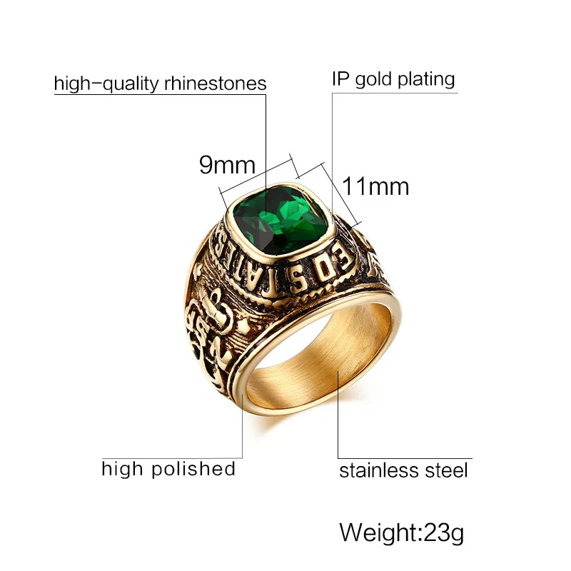 Это смелое кольцо доступно в армейском или морском стиле с Черный Зеленый Красный CZ камень Центральный камень, или военно-воздушные силы или военно-морские силы с имитацией рубинового Изумрудного черного оникса кристаллического центрального камня. Кольцо изготовлено из позолоченной латуни с гальваническим покрытием.