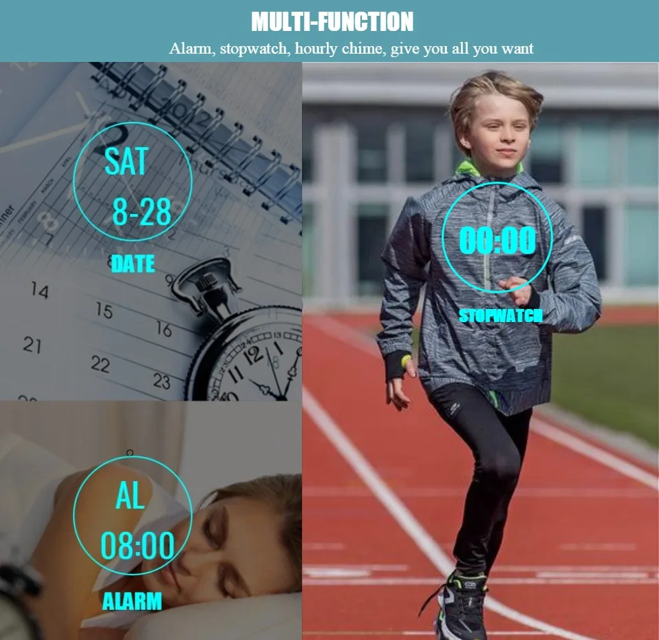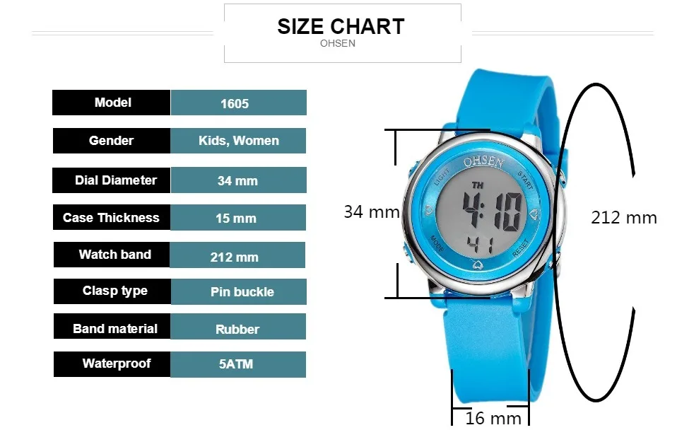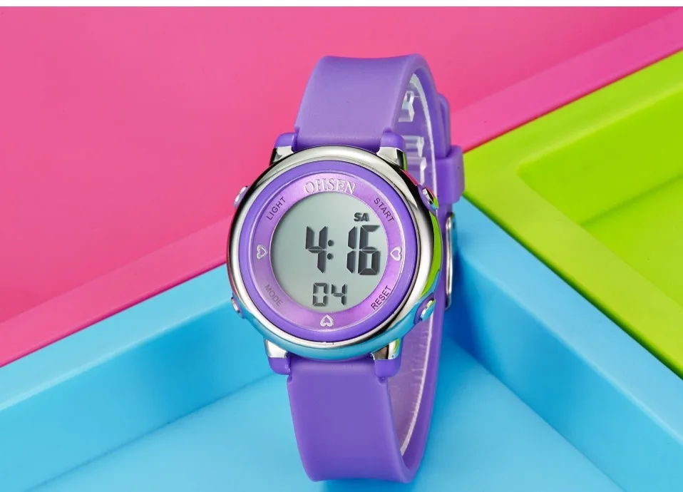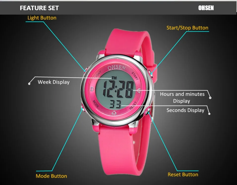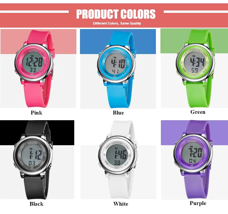 Новая модель высокого качества Цифровой: часы, минуты, секунды, вечера, месяц, дата, день Формат 12/24 часов Будильник и функция ежечасного звонка Специальная конструкция с хронограф (секундомер) при температуре не выше 0,01 второй шаг Дополнительные 7 видов цветов ЖК-дисплей задняя светильник функция отображения времени четко в темноте Водонепроницаемость до 50 м (не нажимайте кнопку в воде)