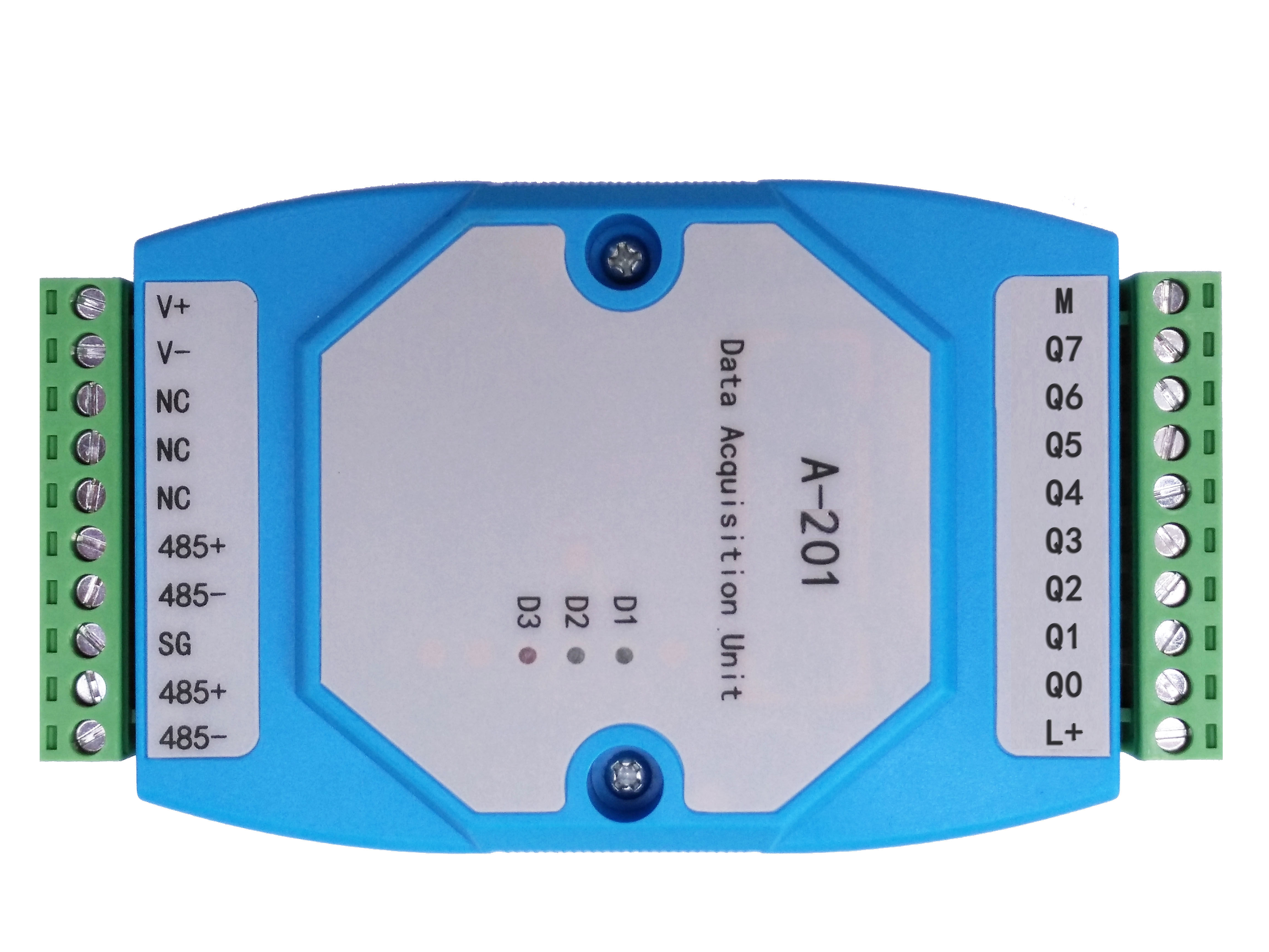 1 Введение продуктаA-201 (8-полосный изолированный модуль цифрового выхода на основе Modbus) широко используется в металлургической, химической, механической, пожарной, строительной, электрической энергии, транспорт и другие промышленные отрасли в качестве общего цифрового модуля сбора количества. Он имеет 8 изолированных выходных каналов переключения. Стандартный протокол Modbus RTU может использоваться вместе с другими устройствами, которые соответствуют протоколу Modbus RTU.Обзор системы 1,1Модуль A-201 в основном состоит из схемы питания, схемы ввода изоляционного переключателя, изолированной схемы приемопередатчика RS485 и MCU. Высокоскоростной процессор ARM используется в качестве блока управления, а изолированный интерфейс связи RS485 имеет функцию ESD, перенапряжения и защиты от перегрузки по току, что позволяет избежать влияния сигнала промышленного поля на интерфейс связи модуля и делает связь стабильной и надежной.1,2 Основные технические индикаторы1) Параметры системыНапряжение источника питания: 8 ~ 30 В постоянного тока, защита задней части блока питанияПотребляемая мощность: 0,5 ВтРабочая температура:-10 C ~ 60 CТемпература хранения:-40 C ~ 85 CОтносительная влажность: от 5% до 95% без конденсации2) параметры цифрового выходаКоличество входов: 8Тип входного сигнала: выход транзистора открытой цепи коллектораМаксимальное напряжение нагрузки: 30 В постоянного токаМаксимальный ток нагрузки: 0.5A3) интерфейс связиИнтерфейс связи: RS485 интерфейс, изоляция 1500VDC, + 15kV ESD защита, защита от перегрузки по токуНапряжение изоляции: 1500 ВПротокол связи: протокол Modbus RTUСкорость передачи данных: 1,2 k, 2,4 k, 4,8 k, 9,6 K, 19,2 k, 38,4 k, 57,6 kФормат передачи данных: 1 пусковой бит, 8 бит данных, нет, нечетный или ровный паритет, 1 или 2 стоп-бит.1,3 форма и размерМатериал корпуса: АБС-пластикРазмер: 125 мм (длина) * 70 мм (ширина) * 25 мм (высота)Способ установки: Стандартная DIN35 направляющая установка