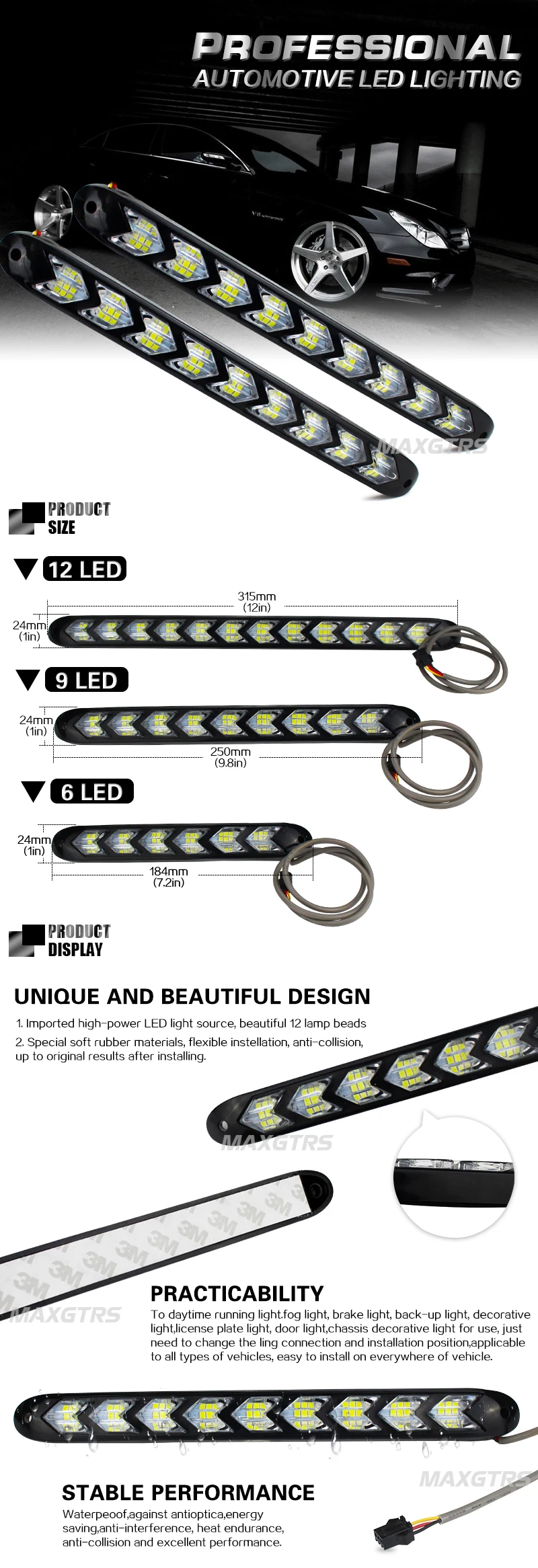 2x Авто дневные ходовые огни, Белый/янтарный горки светодиодный Knight Rider полосы светильник головной светильник со стрелкой Flasher DRL указатель поворота ВодонепроницаемыйОписание:Новый светодиодный полоски с растягивающимся дизайном для универсально подходят для любого автомобиляГибкий, чтобы вы могли согнуть его вдоль изгиба фары для идеальной посадкиКаждый светодиодный блок питается от 6/9/12 шт. двухцветных светодиодный-модулейКсеноновый Белый светодиодный фонарь для дневных ходовых огней и последовательный Янтарный светодиодный фонарь для указателей поворотаДлина: 184 мм/250 мм/315 ммЦвет: ксеноновый белый/желтыйСодержание: одна пара светодиодный трубки светодиодные полосы светаКаковы преимущества этого вида светодиодной ленты?1. Выглядит как кристалл, элегантный и приятный.2. Он гибкий, вы можете установить его на любой ca3. Это двойной цвет: белый, как правило, для функции дневной ходовой светильник, золотой, как правило, для функции поворотный светильник. Он автоматически управляется контрольной коробкой.4. Легко установить, просто подключи и играй. Вы можете DIY (сделать это самостоятельно), чтобы приклеить его любой формы, как Любой ШАП вам нравится.5. Он водонепроницаемый и очень хорошего качества.Установка:Белый светильник (дневной ходовой светильник) =ПодключитеЧерный проводС отрицательным полюсом,Белый провод + красный проводСоедините с положительным полюсом.Желтый последовательный светильник (поочередно) =ПодключитеЧерный проводС отрицательным полюсом,Белый провод + желтый проводСоедините с положительным полюсом