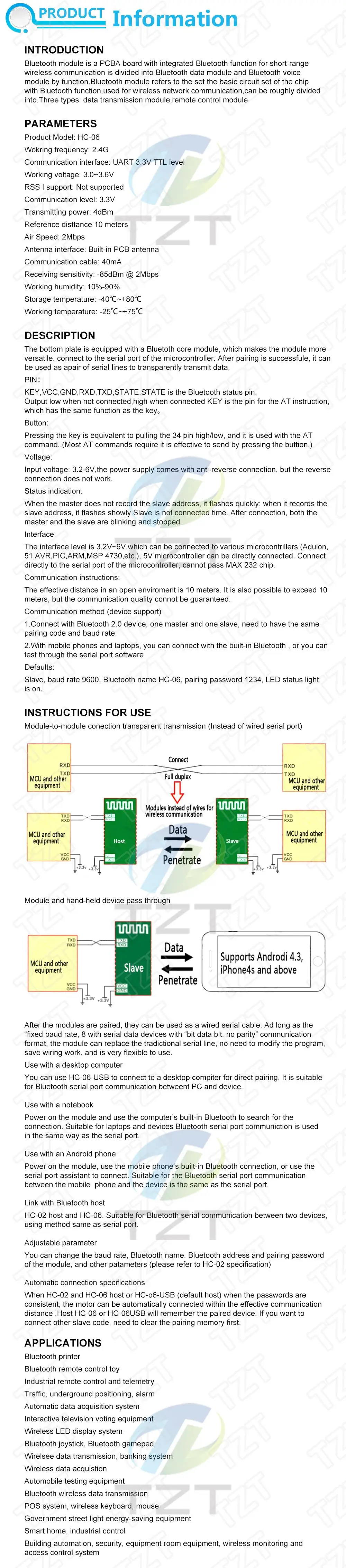 Используя HC - 06 из модуля 1, основной модуль, который ведет к интерфейсу, включает в себя VCC, GND, TXD, RXD, резервный светодиодный выходной штырь, MCU может указать, подключен ли bluetooth через стопу, от ключа машины является недействительным