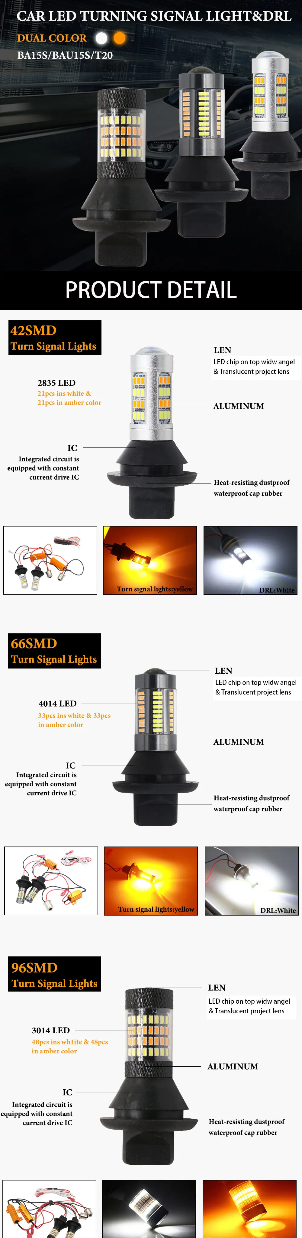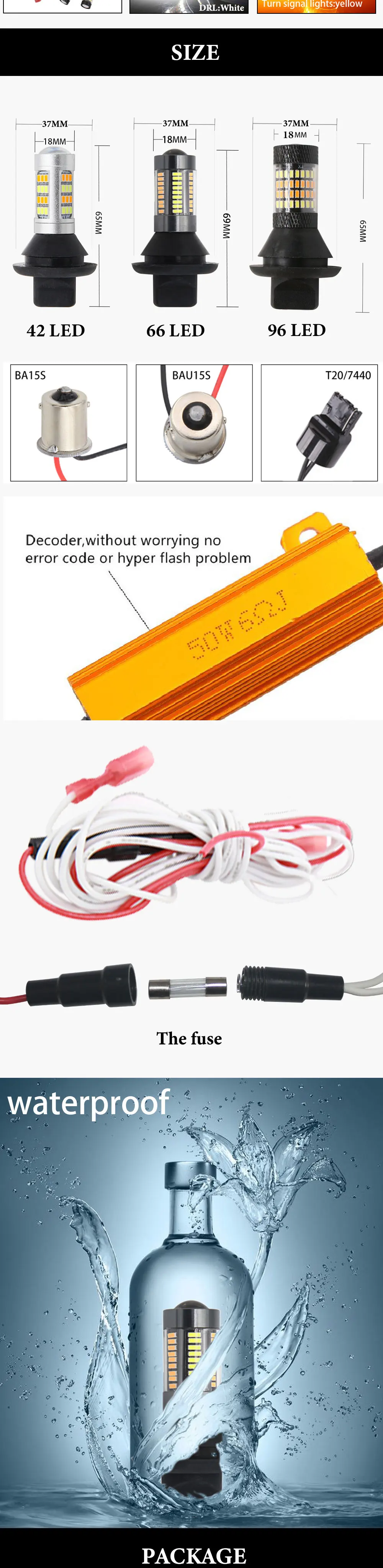 Параметры: Наименование товара: светодиодный светильник с поворотным сигналом (декодирование) Тип модели: 1156/BA15S/P21W,T20/7440,T25/3156 Напряжение: 12 В постоянного тока Световой поток: 1000LM Цветовая температура: 3000K (желтый)/6000K (чисто белый) Материал: amuminum Светильник угол: 360 градусов Режим: дневной ходовой светильник + сигнальный светильник поворота Lifespann: 30000 часов Светодиодный цвет: дневной ходовой светильник (чисто белый), сигнальный светильник поворота (желтый/голубой). Особенности: Изготовлено с высоким качеством SMDs, может выдерживать тряску и вибрацию. 66 * Высокая мощность SMD светодиоды лампы намного ярче, чем оригинальные лампы накаливания, и низкое энергопотребление. Отсутствие стробоскопической сигнализации без декодирования делает ваш автомобиль на минуту другой функцией. Запустите автомобиль, чтобы включить режим Дневной светильник, поверните при автоматическом преобразовании в режим рулевой лампы. Материал: светодиодный чип высокой яркости, авиационный тонкий алюминий Замените лампу оригинального автомобиля на светодиодный светильник, затем линия, подключенная к источнику питания ACC, может быть реализована яркий белый светильник во время вождения при смене на желтый светильник и мерцании при повороте.