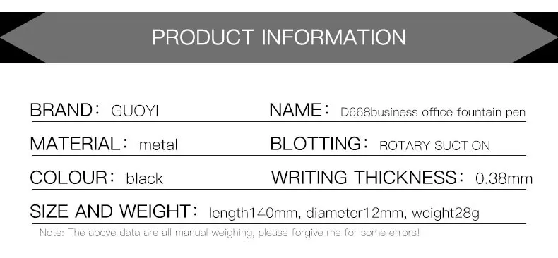 Материал: металл Длина: 13,9 см Вес одной ручки: 31 г Цвет изделия: черный В ручке нет чернил, чернила нельзя передавать, и клиенты, которым нужно купить, могут купить чернила в вашем местном регионе.