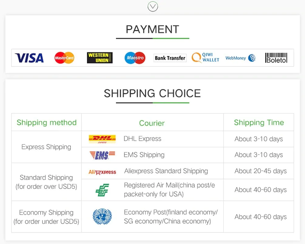 Каждый товар будет отправлен заказной почтой, чтобы вы могли отслеживать статус доставки онлайн. Пожалуйста, проверьте время доставки AliExpress стандартную доставку.