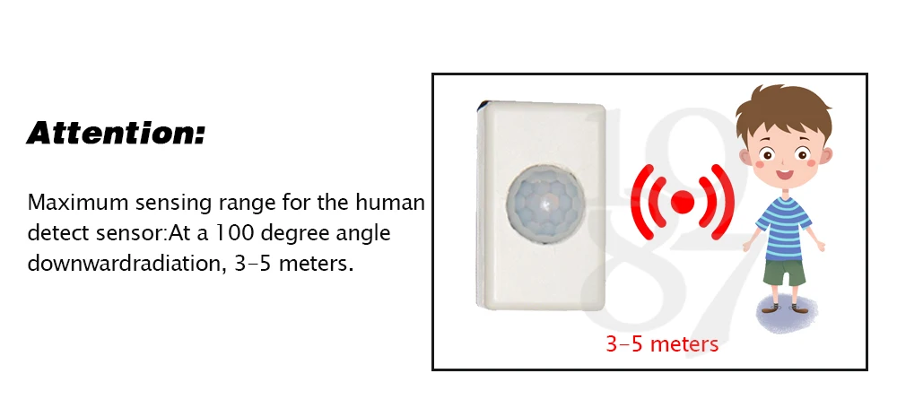 Максимальный диапазон чувствительности для датчика обнаружения человека: на 100 градусов угол вниз излучения, 3-5 метров.