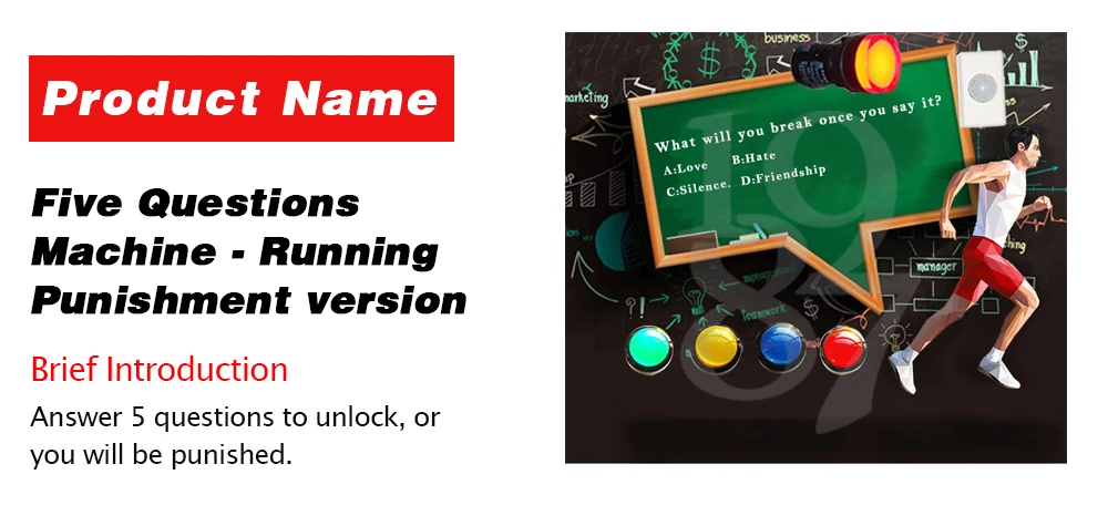 Ответьте на 5 вопросов, чтобы разблокировать, иначе вас накажут. Приключений должен отвечать на 5 вопросов, одна 12v эм замок выпустит. Если вы ответите на неправильный вопрос, игрок будет punished Ен. Ему нужно пробежать некоторое время, у него будет шанс снова ответить на этот вопрос.