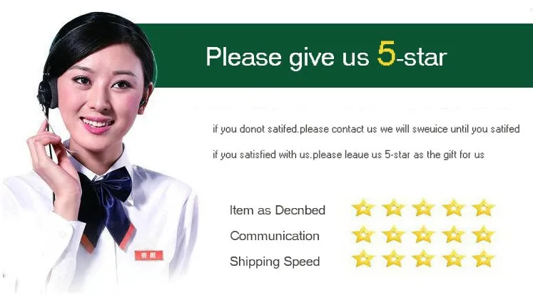 Стандартная служба – авиапочта Китая.Обычно мы отправляем товары в течение 3–5 дней после подтверждения оплаты за 24 часа. Пожалуйста, пришлите нам электронное письмо перед оплатойЕсли вы хотите изменить адрес доставки.Почта Китая воздухаПочта обычно прибудет в течение 15-25 рабочих дней после отправки. Иногда для таможни или погодыПроблема будет отложена на несколько дней. Это может быть до 30-45 дней.В праздники (например, Рождество, китайский Новый год и т.д.) доставка может занять больше времени. Пожалуйста, добавьтеЕще 5-10 дней в качестве задержки.Отзывы:Удовлетворение ваших запросов и положительная обратная связь очень важны для нас. Пожалуйста, оставьте положительный отзывы и 5 звездДовольны нашими товарами и услугами. Если у вас есть какие-либо проблемы с нашими товарами или услугами, пожалуйста, не стесняйтесьСначала свяжитесь с намиПеред тем как оставить негативный отзыв. Мы сделаем все возможное, чтобы решить любую проблему и предоставить вамС лучшим обслуживанием клиентов.