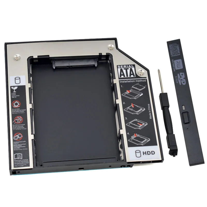 1. 100% Brand New & Never Used Item; 2. The thickness of this adapter is 12.7mm; 3. Internal Interface: SATA (for 2.5" HDD/SSD or ssd drive); 4. External Interface: SATA (for Laptop/ Mother Board); 5. The 2nd Hard Disk Drive Caddy / Adapter to bring you new maximum data storage flexibility. With the second HDD in your Laptop, 6. You can speed to backup important applications and critical data ( Simply remove your CD-ROM drive and put the Caddy (with the added hard drive) in its place.Features: