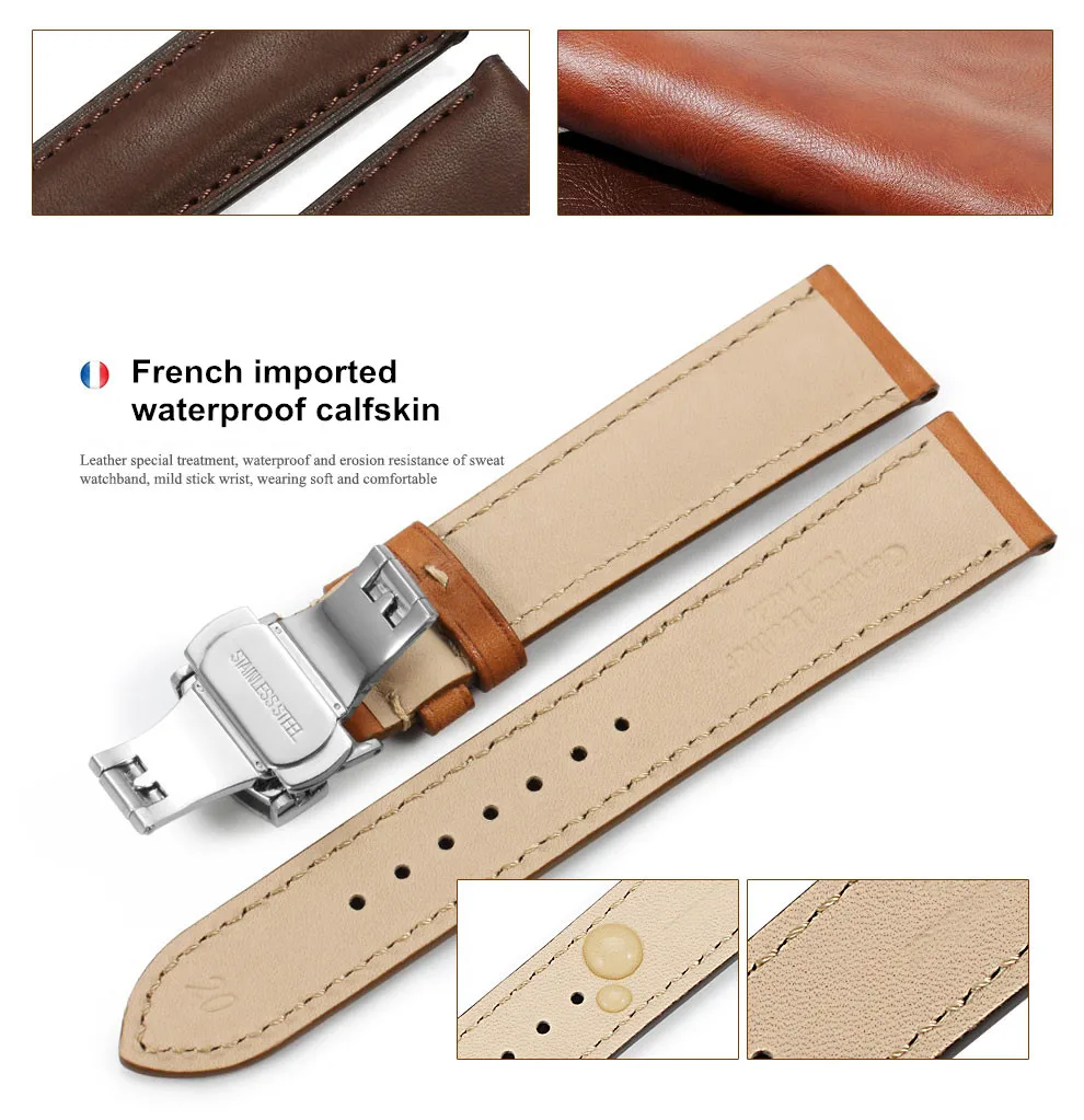 Параметры: Материал: натуральная кожа. Ширина полосы пропускания: 18 мм 19 мм 20 мм 21 мм 22 мм Цветовая полоса: черный, коричневый Характеристики: дышащий, пыленепроницаемый, водонепроницаемый, мягкий и прочный. Тип застежки: распределение пряжки Длина: длина: 120 / 80 мм (за исключением 115/75 мм в поясе 18 мм), длина ремня 120 мм, а самая короткая-20 мм. Толщина: около 3 мм-5 мм Тип спорта: фитнес, плавание, дайвинг, альпинизм