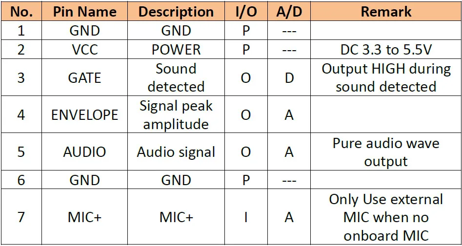 1. Низкая стоимость, простота в использовании. 2, усиление = 510, и его можно настроить, установив резистор 3, встроенный микрофон или внешний микрофон 4, цифровой выход, если звуковой вход или нет 5, аналоговый выход для значения звукового входа 6, аудиовыход сигнала для аудио приложения