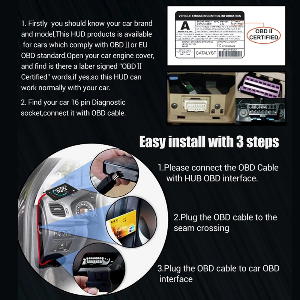 4. Легко установить, только нужно подключить HUD с автомобильным OBD портом по OBD кабелю, HUD будет отображаться, когда автомобильный двигатель ВКЛ/ВЫКЛ