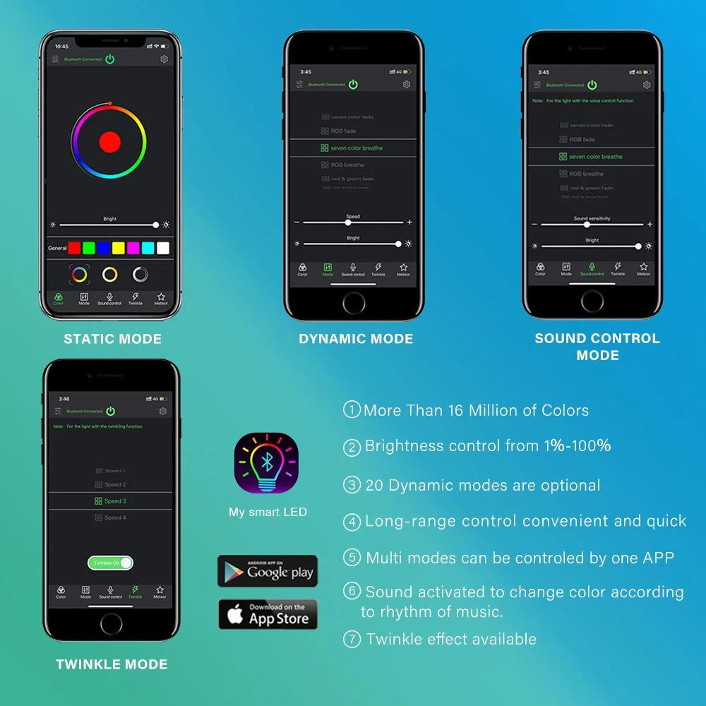 Приложение для смартфона управление Bluetooth: 1. Пожалуйста, загрузите приложение «Мой умный светодиодный» 2. Подключение устройства Bluetooth (1) Откройте Bluetooth мобильный телефон; (2) Включение лампы; Затем откройте приложение; (3) в это время приложение автоматически подключается к креплению на светильник Bluetooth. ** Не подключайте Bluetooth к этому устройству вручную в настройках телефона.