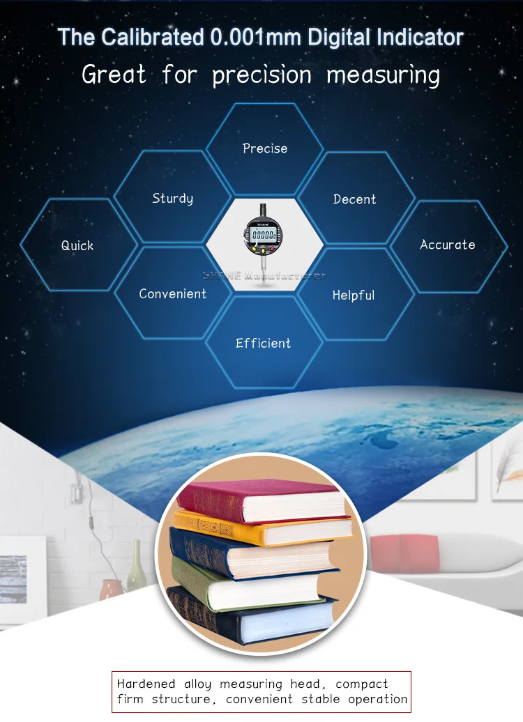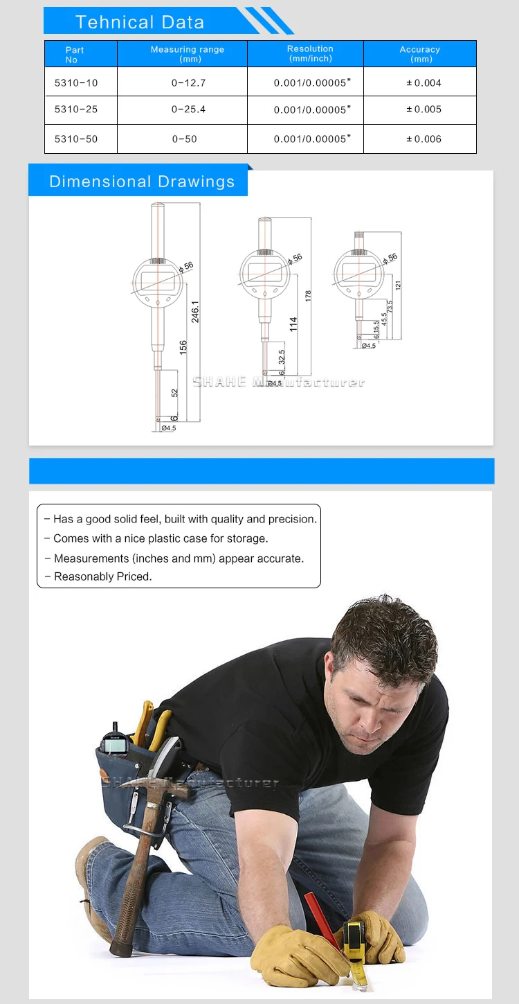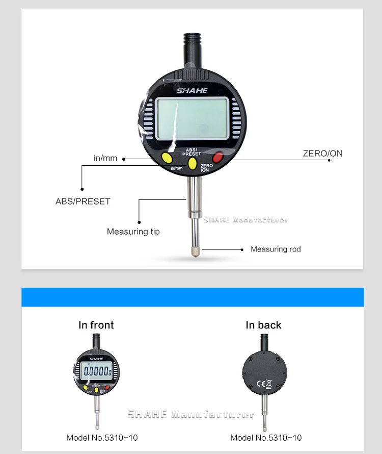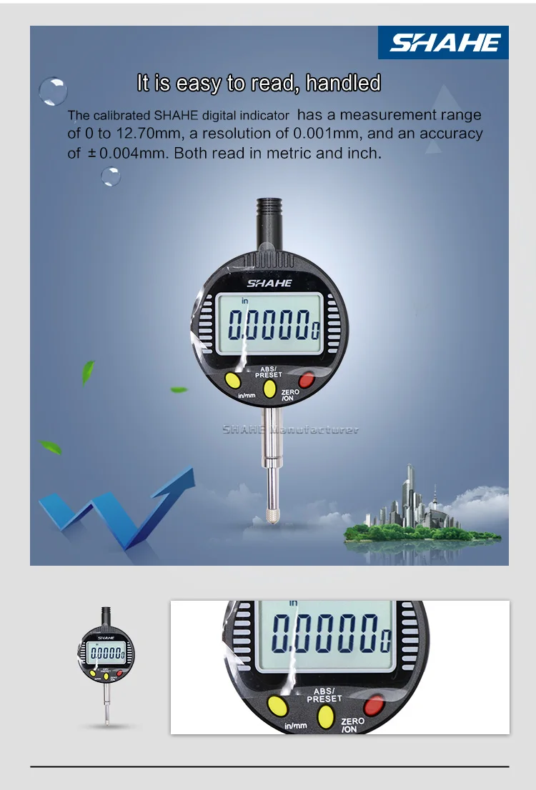 1. Основной материал из закаленного сплава и нержавеющей стали 2. Компактная и прочная структура, удобная и стабильная работа 3. Быстрое отображение измеренного значения на большом ЖК-экране 4. С выключателем питания ВКЛ-ВЫКЛ и автоматическим выключением на выбор 5. Три функциональных клавиши 6. Установка нуля в любом положении 7. Преобразование системы измерения мм/дюйм 8. Измерение для погрешности формы и положения, например, избиение количества, прямолинейность, паралелизм, плоскость и т. д.